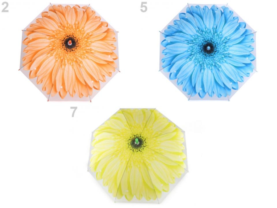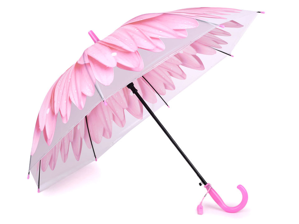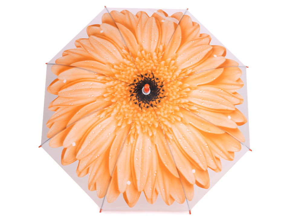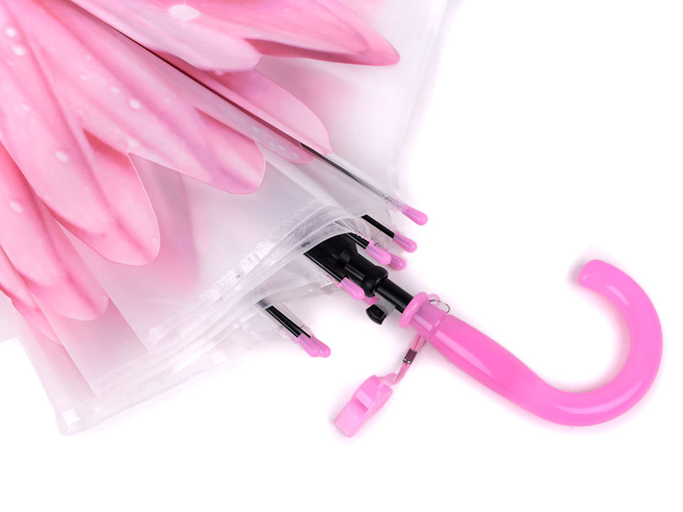 Dětský vystřelovací deštník s designem velkého rozevřeného květu se doslova rozzáří nad hlavou. Na rukojeti má píšťalku.