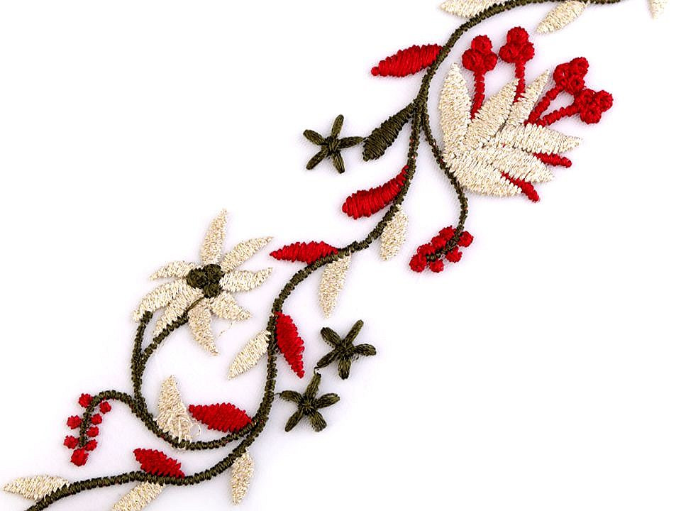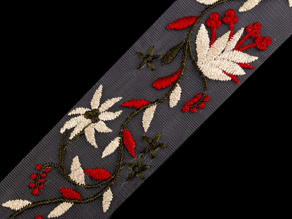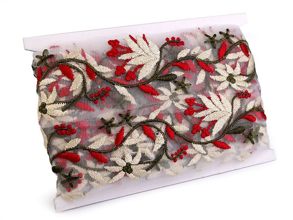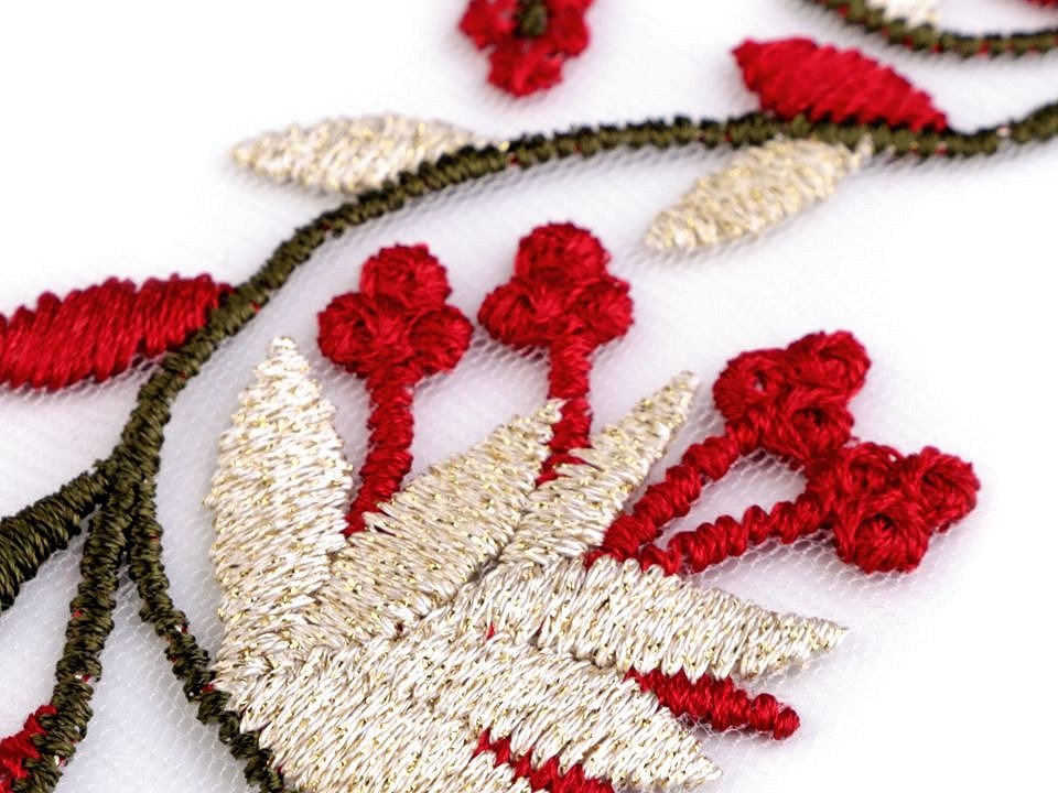 Zajímavý prýmek na tylu zdobí květinová výšivka. Lurex mu dodává efektní třpyt.