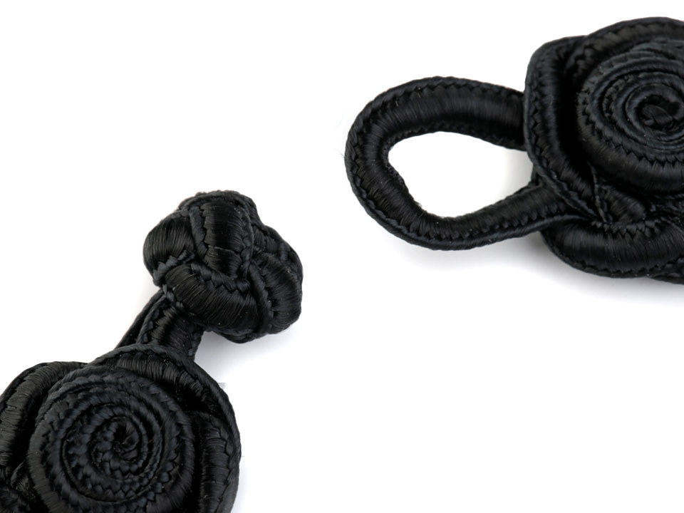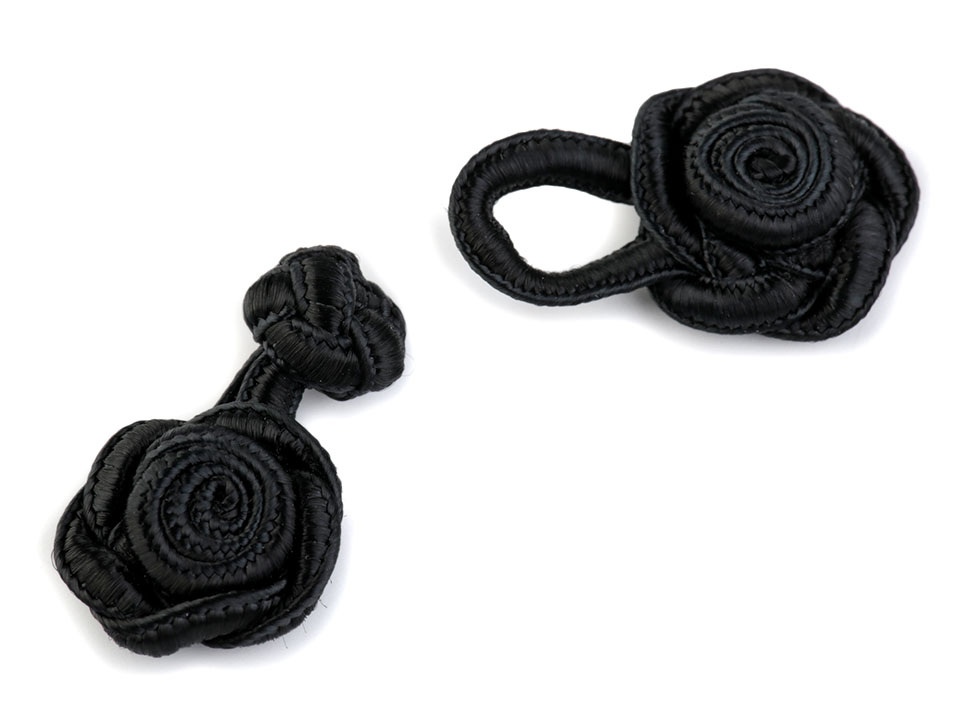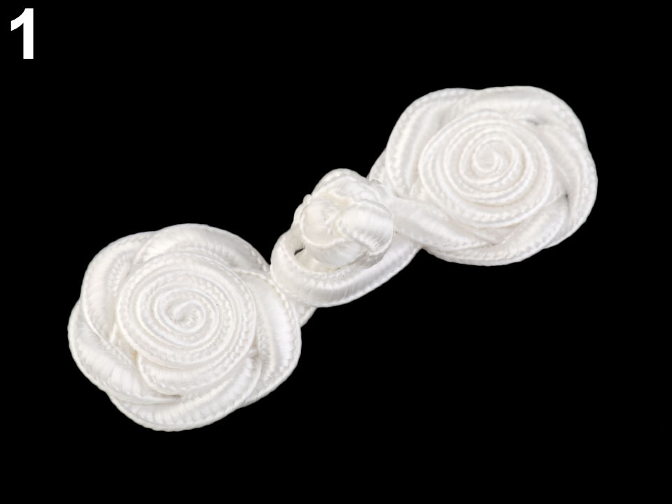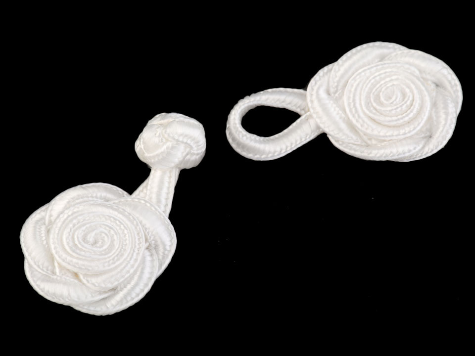 Textilní zapínání připomíná květy růže. Skládá se ze dvou dílů. Zapínání je vhodné na vesty, kimona, lehké svetříky apod. Můžete ho použít i na papírové krabičky nebo pouzdra.