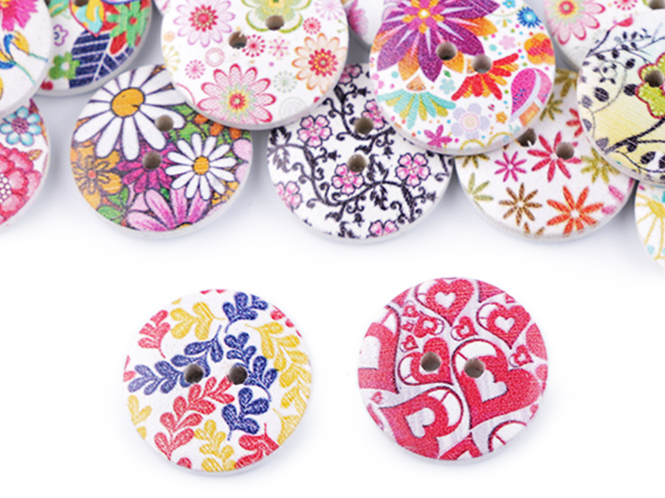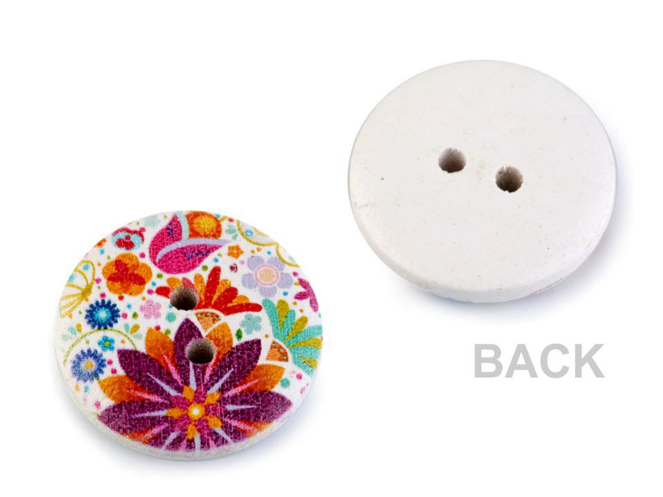 Dekorační knoflíky s potiskem barevných květů ozdobí vaše foto rámečky, přáníčka, pozvánky, deníky apod.