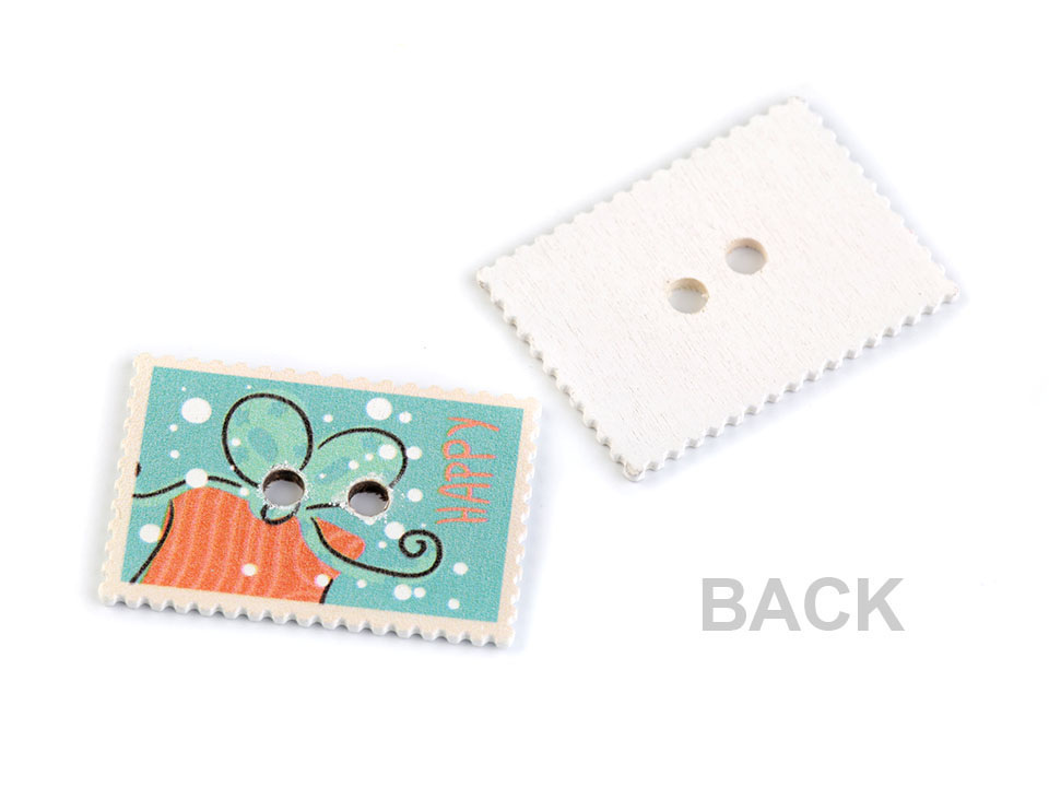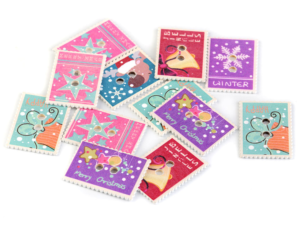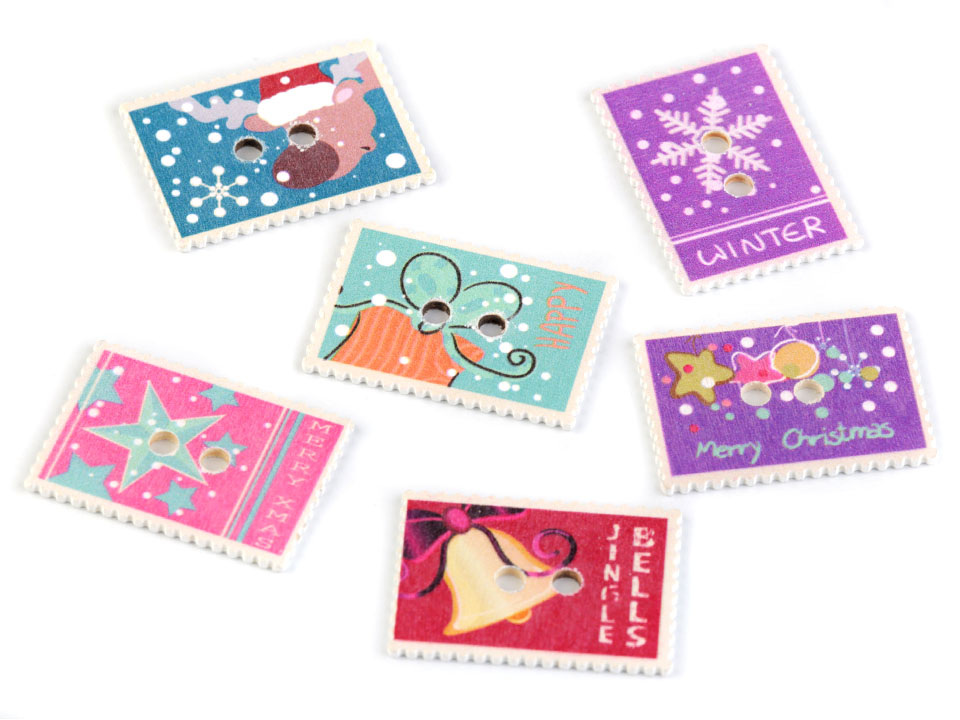 Dřevěné dekorační knoflíky ve tvaru známky jsou zdobeny obrázky s vánočními motivy. Knoflíky můžete nalepit na rámečky, přáníčka, pozvánky, deníky apod.