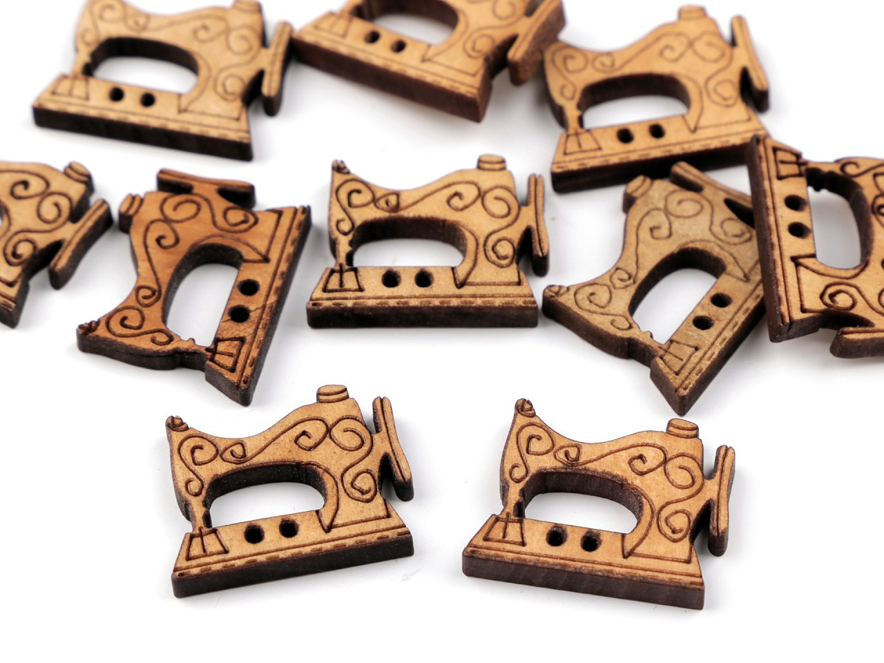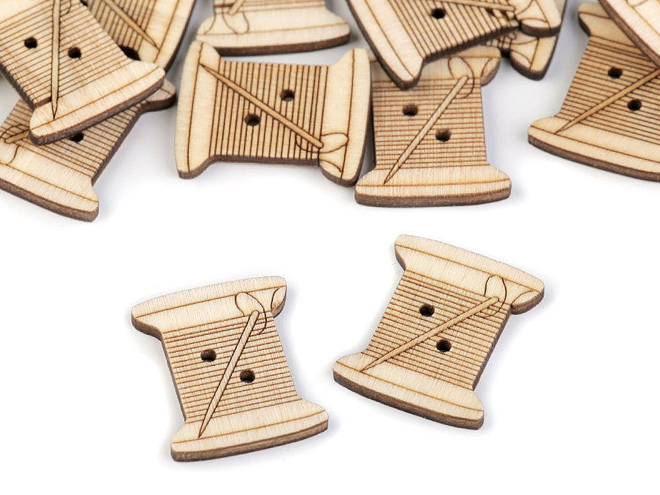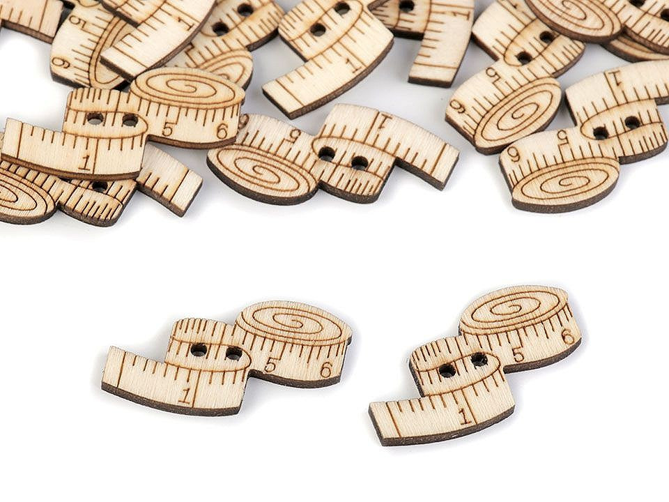 Dřevěné knoflíky potěší hlavně švadlenky a krejčí, protože mají design šicího stroje, cívky, náprstku a metru s vyřezávanými detaily. Využijete je hlavně v technice scrapbooking. Můžete s nimi ozdobit rámečky, přáníčka, jmenovky, pozvánky, deníky apod.
