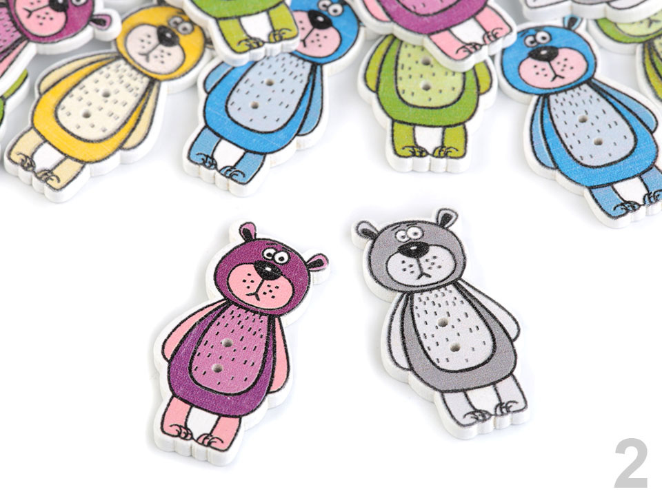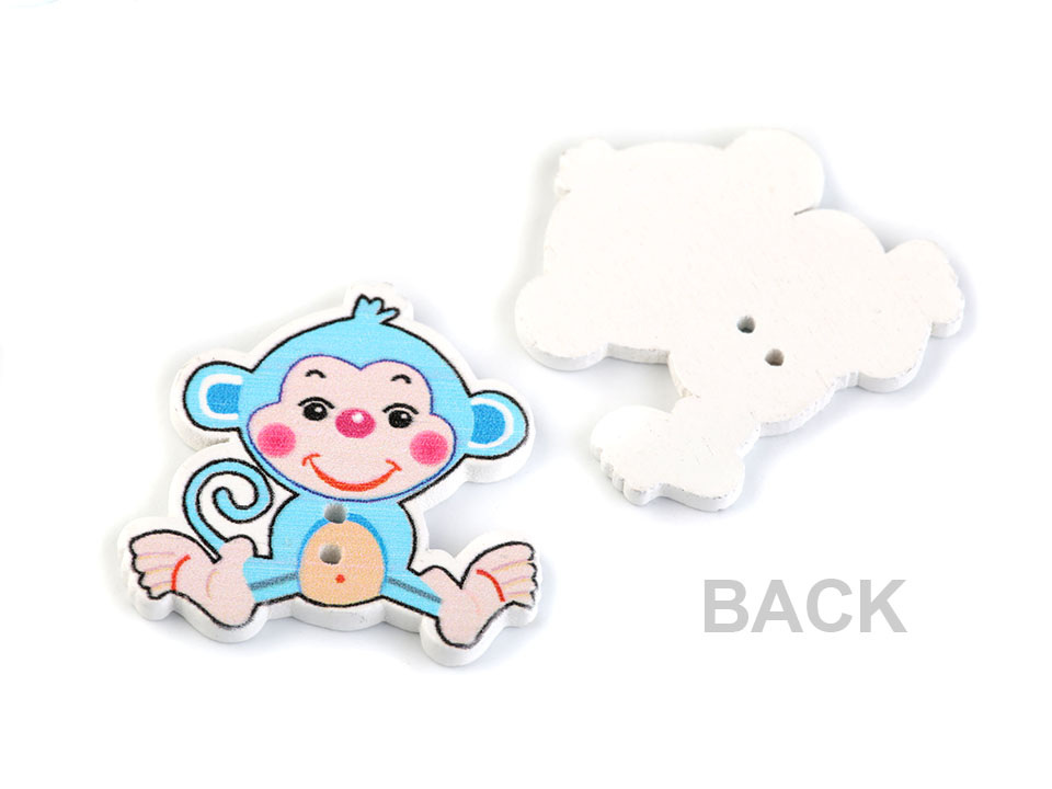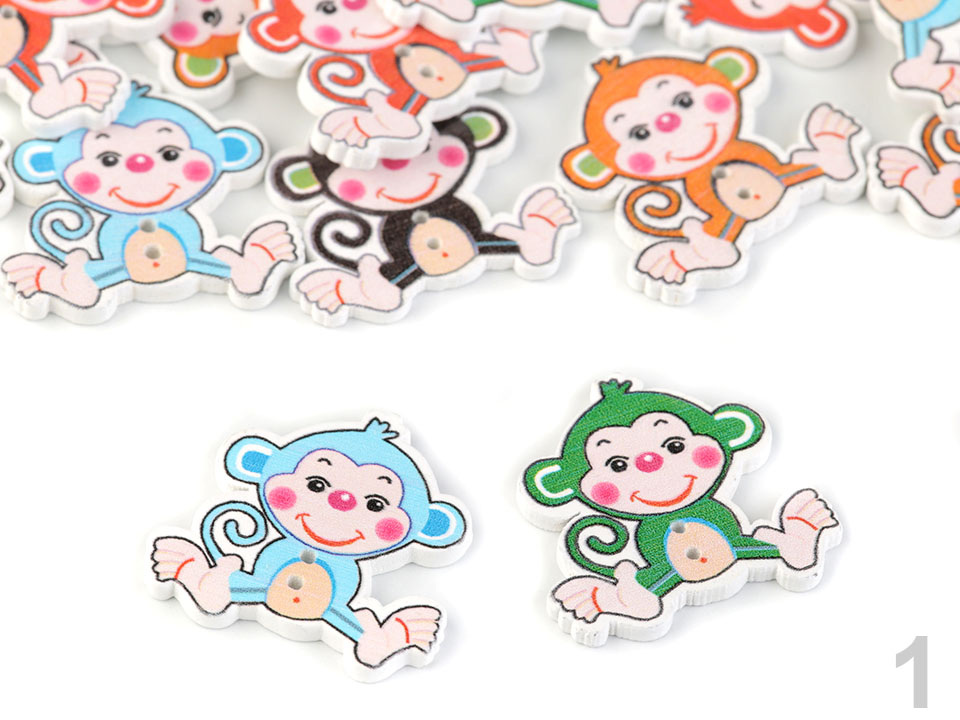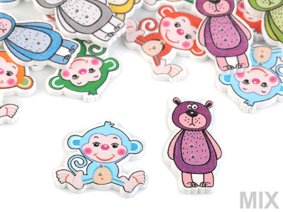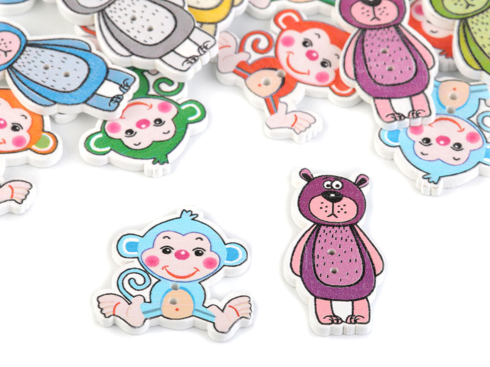Dřevěné dekorační knoflíky s designem opičky či medvídka využijete k ozdobení deníků, alb, pozvánek apod.