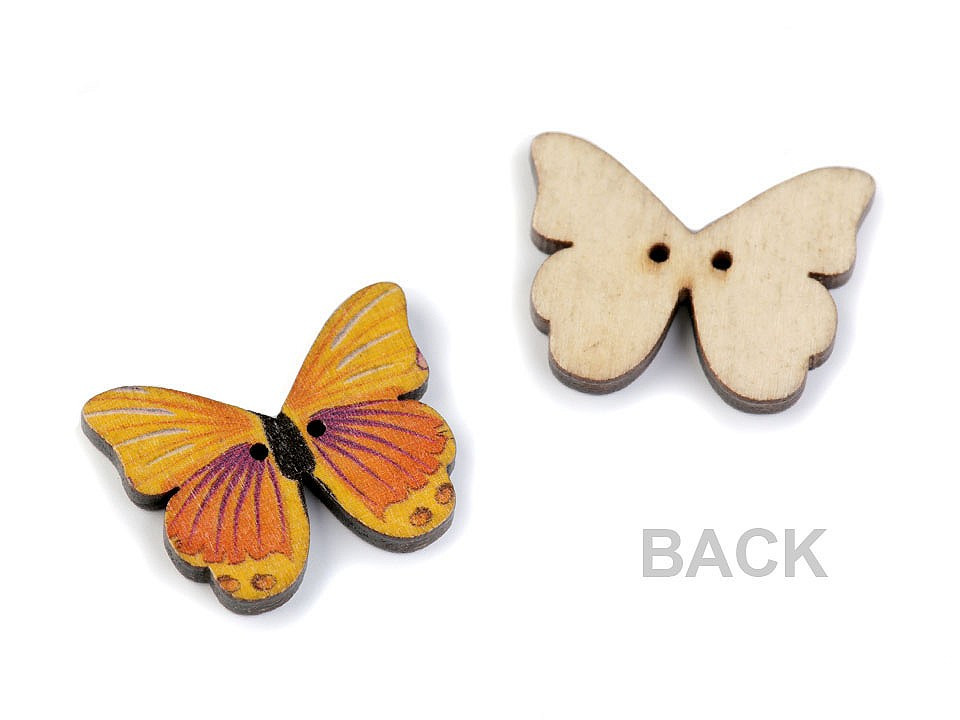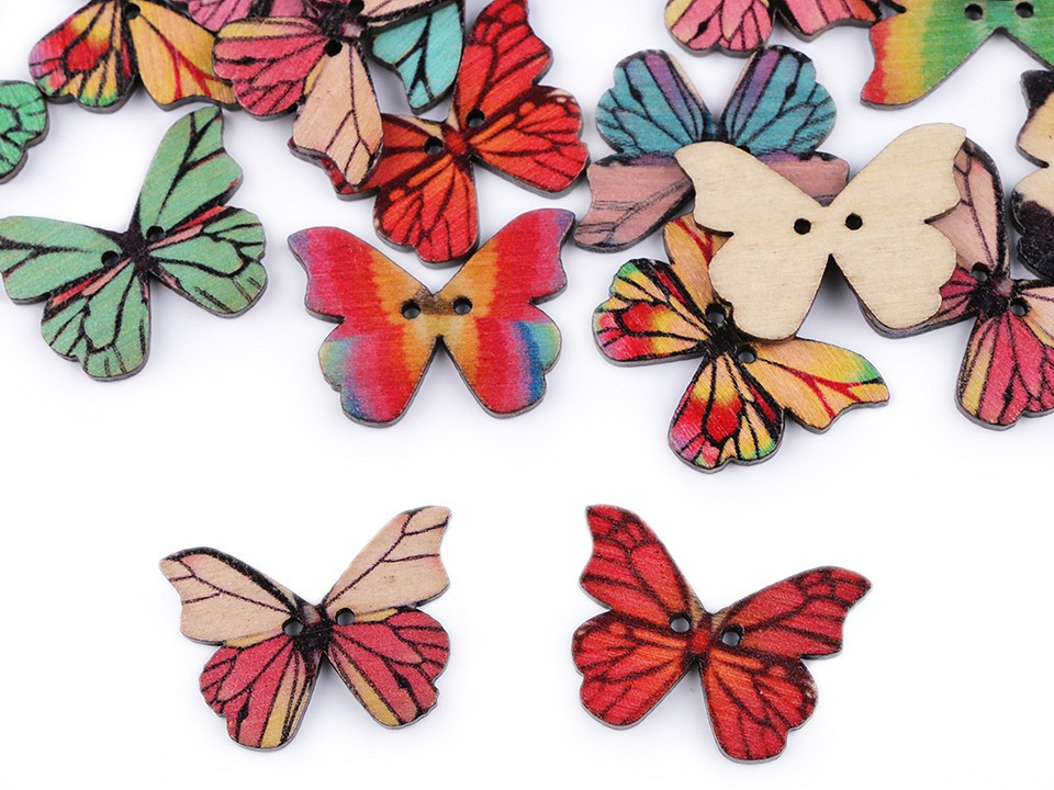 Dřevěné dekorační knoflíky s designem motýla mají okouzlující zabarvení. Můžete s nimi ozdobit krabičky, rámečky, přáníčka, jmenovky, pozvánky, deníky apod. Lze je použít i do květinových vazeb, které se tím krásně oživí.