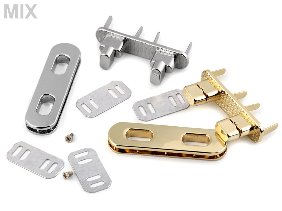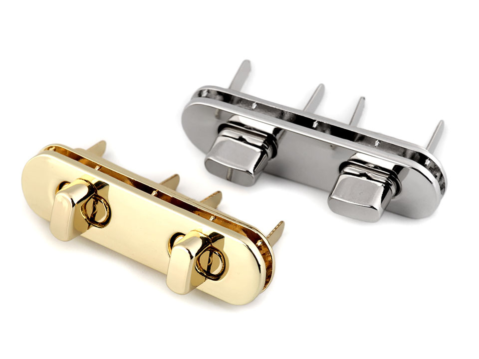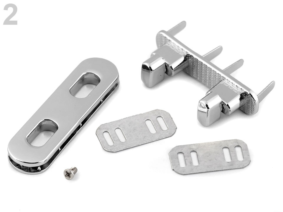 Zapínání na tašku či kabelku je vhodné na tašky s klopou. Jeden díl připevníte pomocí šroubků, a druhý díl pomocí plíšků, skrz které ohnete nožičky.