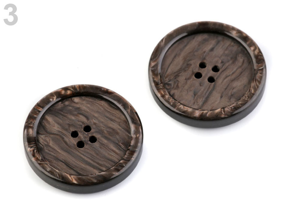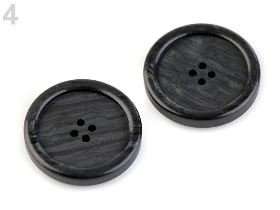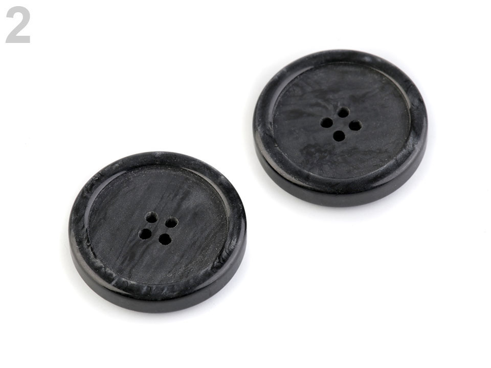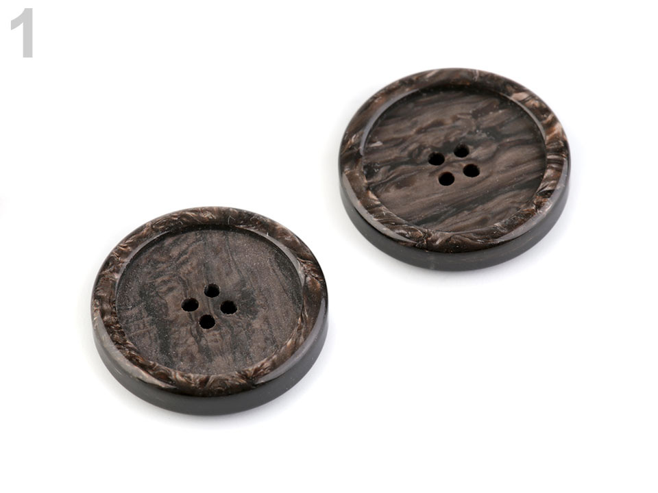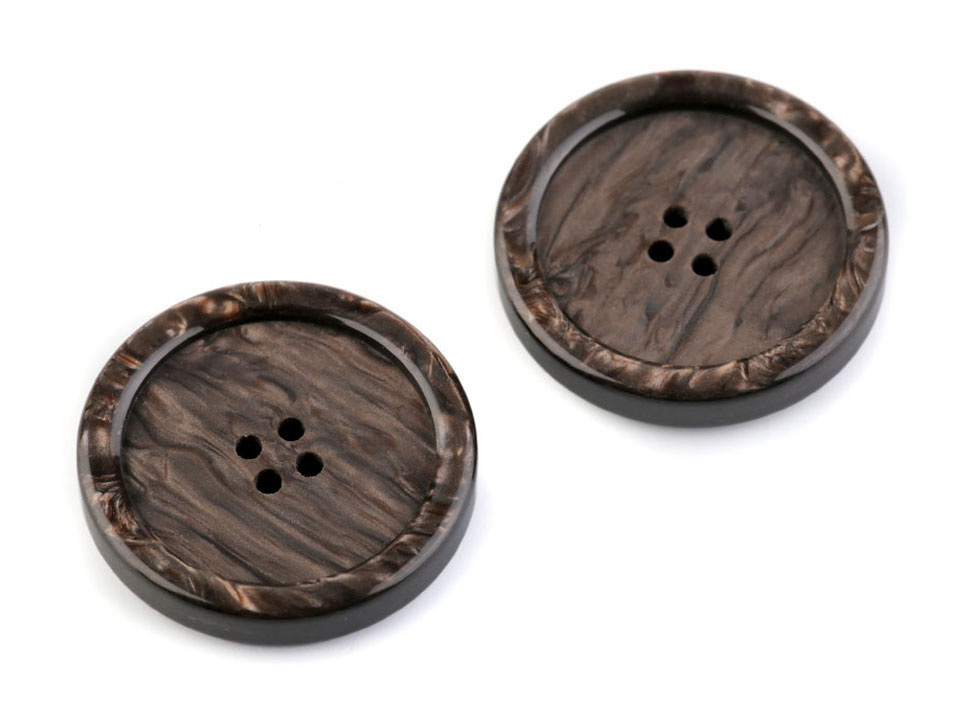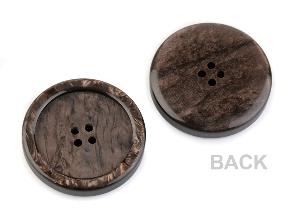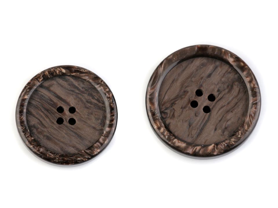 Čtyřdírkové knoflíky mají decentně žíhaný vzor a zvýrazněný okraj. Jsou částečně matné (prostřední část), lem a rubová strana je lesklá.