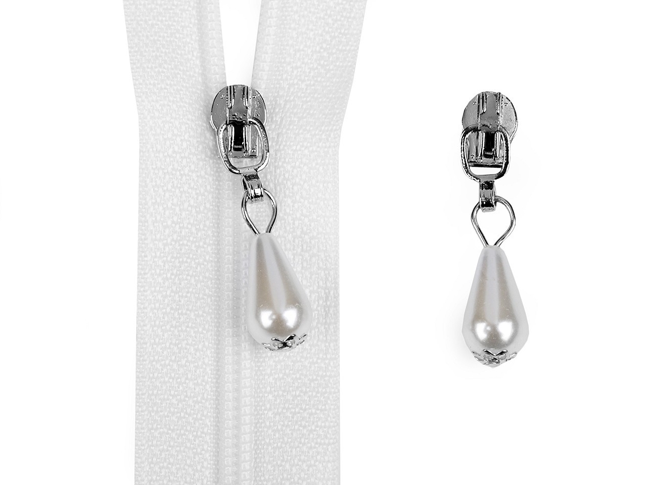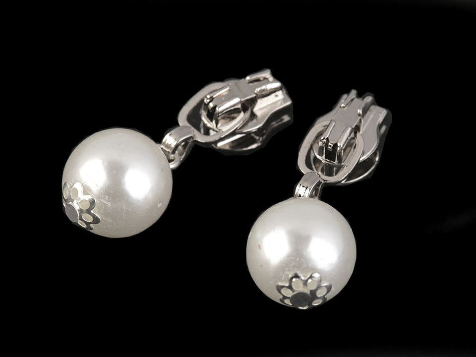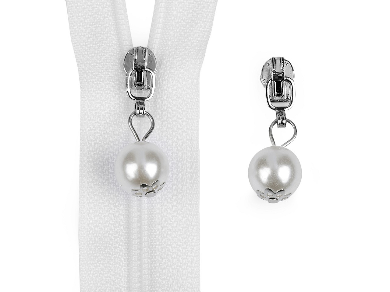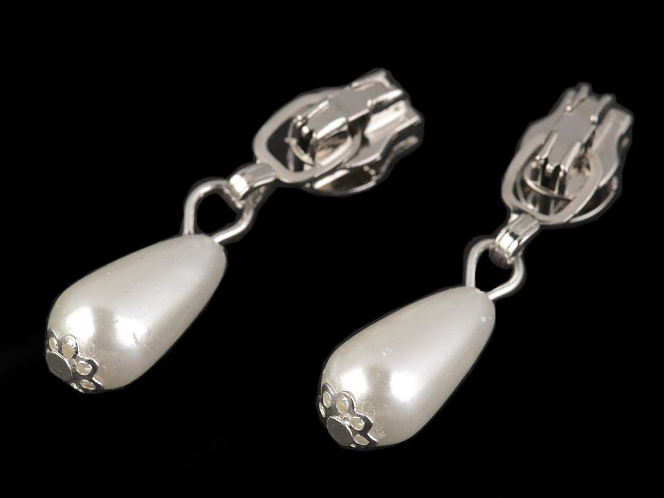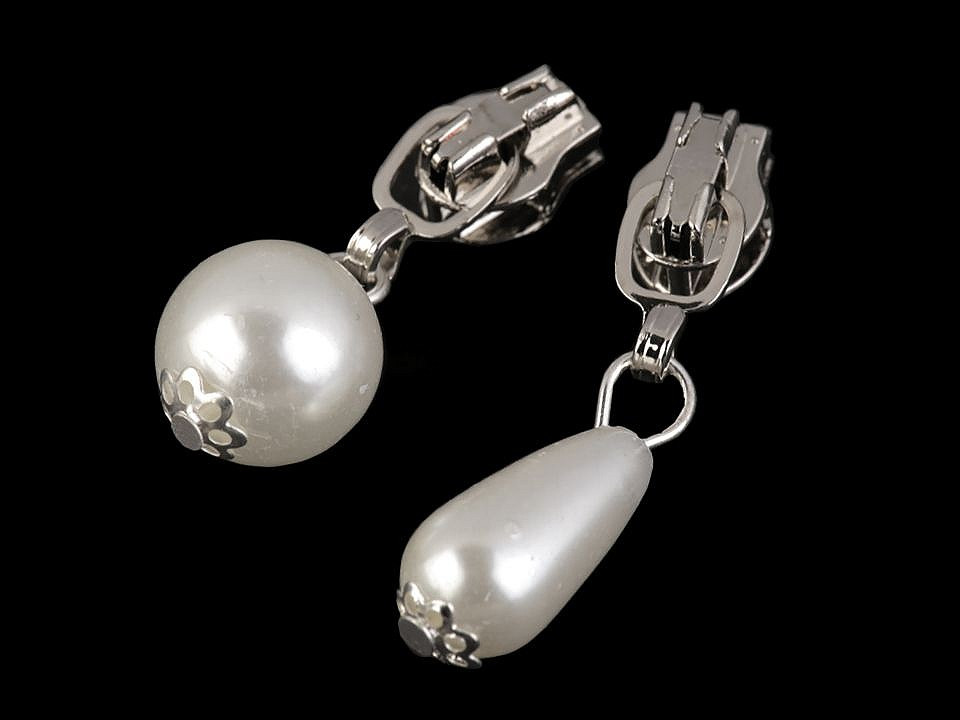 Kovový jezdec zaujme svým táhlem v podobě perlové kuličky a slzy. Je určený ke spirálovým zipům o šíři 3 mm v metráži, které u nás najdete po kódem 107782 a 100802 .
