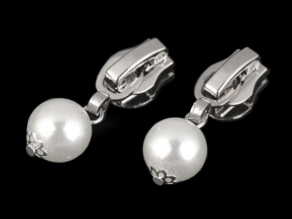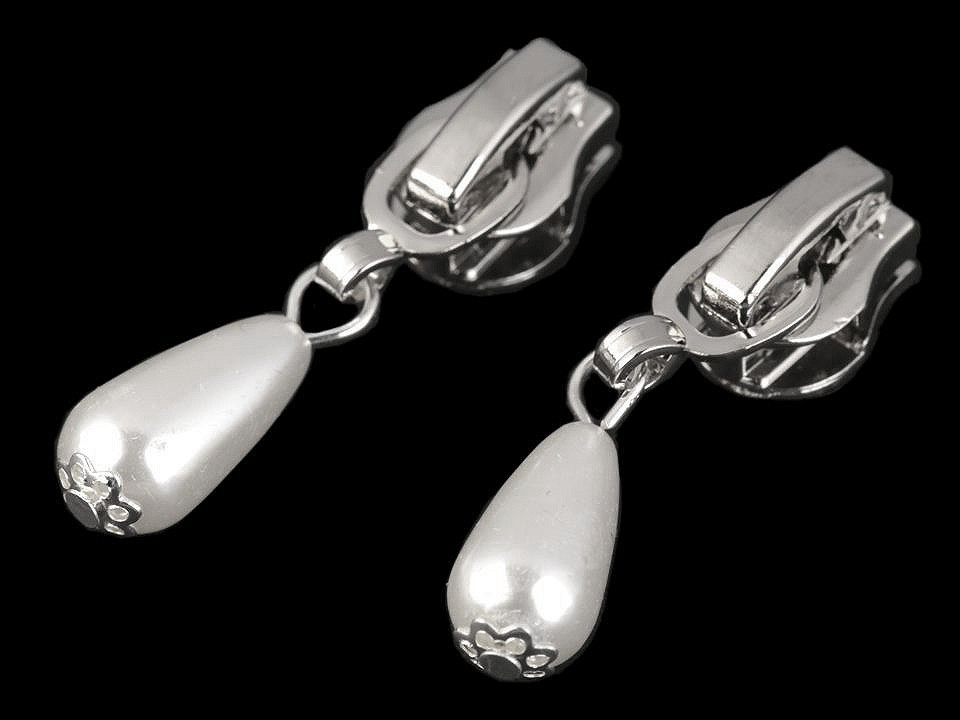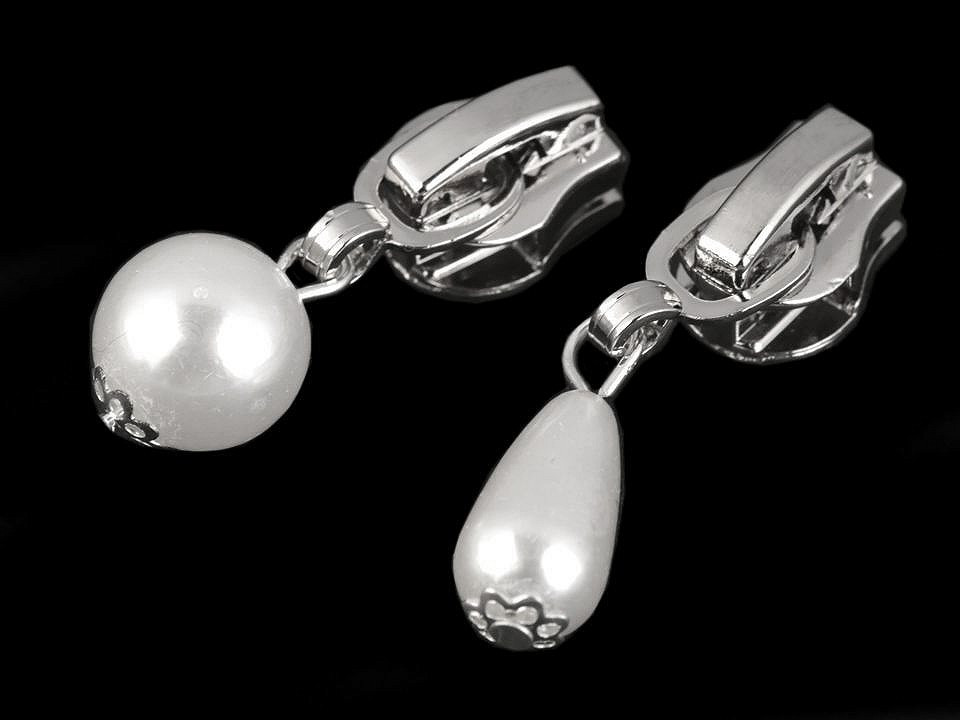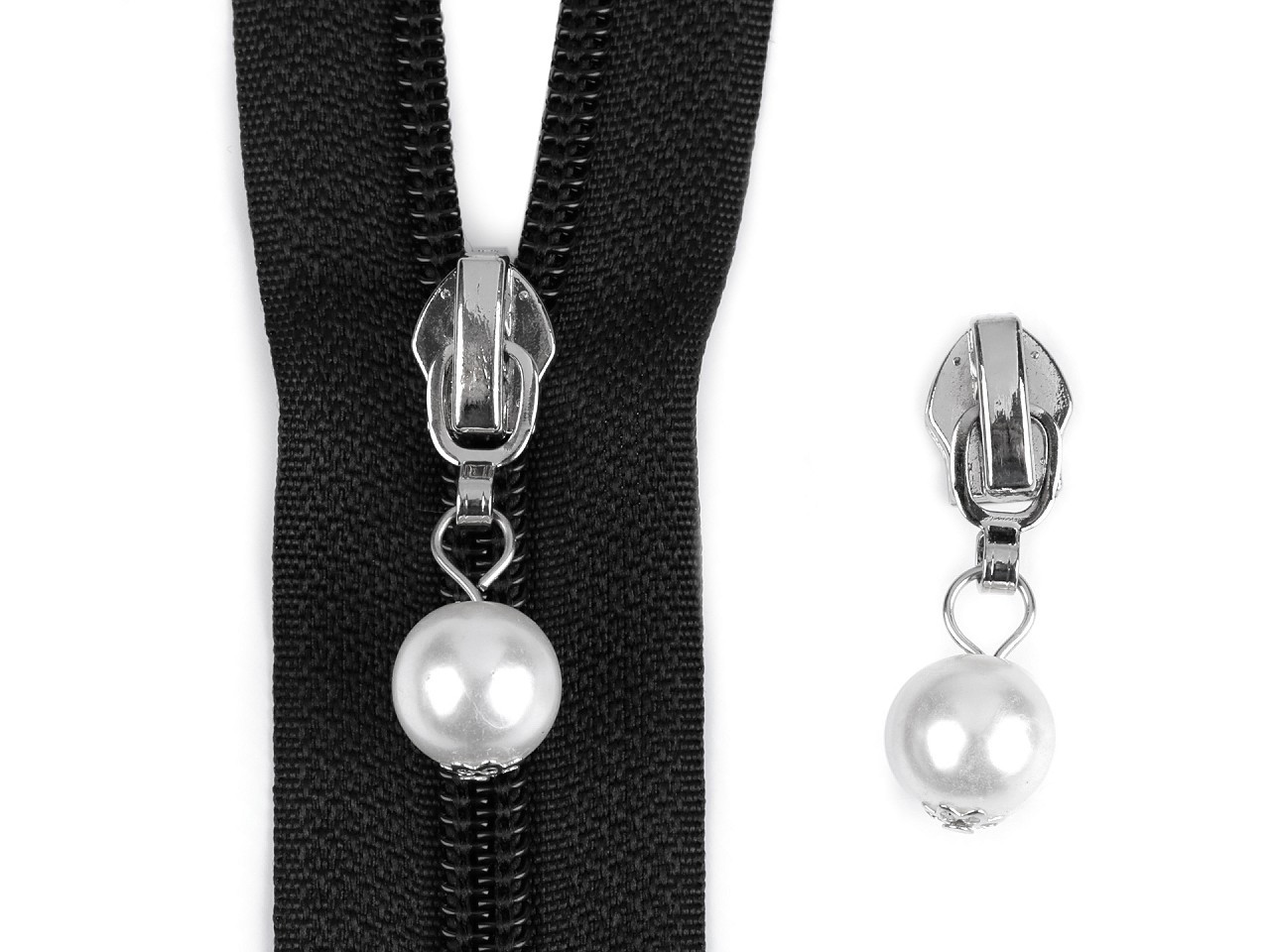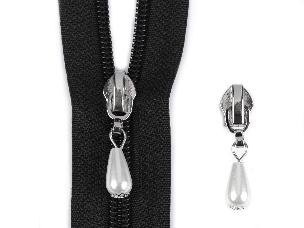 Kovový jezdec má efektní táhlo v podobě perlové kuličky a slzy. Je určený ke spirálovým zipům o šíři 5 mm v metráži, které u nás najdete po kódem 114112, 100803, 116937.