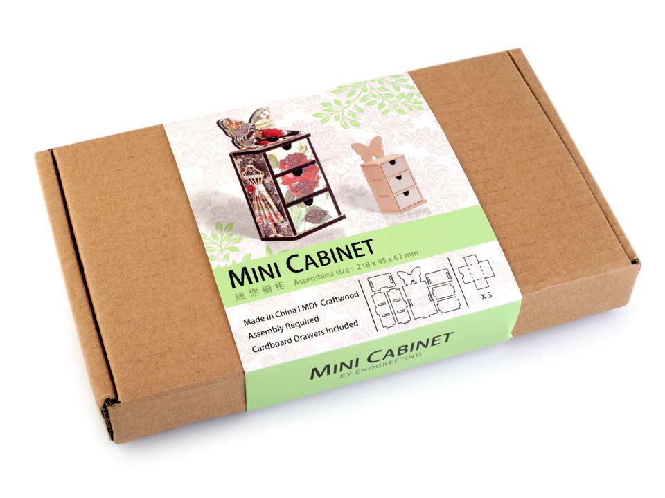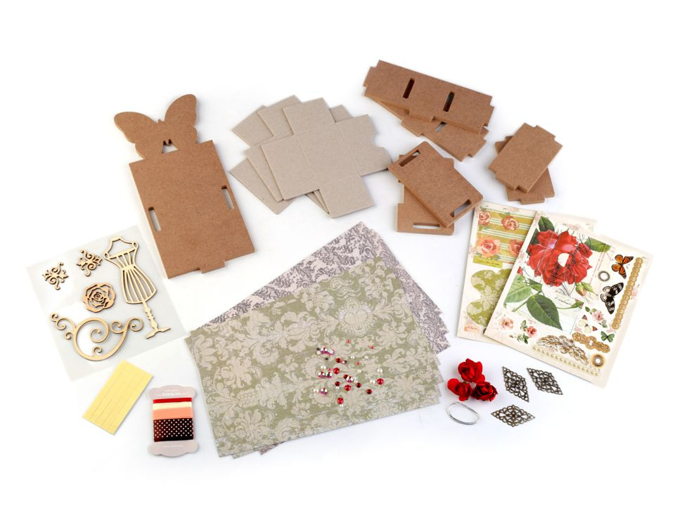 Všechny potřebné díly najdete uvnitř balení. Samotné tělo šperkovnice je z pevného lisovaného kartonu s dřevotřískou, který se svou houževnatostí vyrovná tvrdému dřevu. Slepenou šperkovnici stačí dozdobit podle své fantazie přiloženými doplňky.