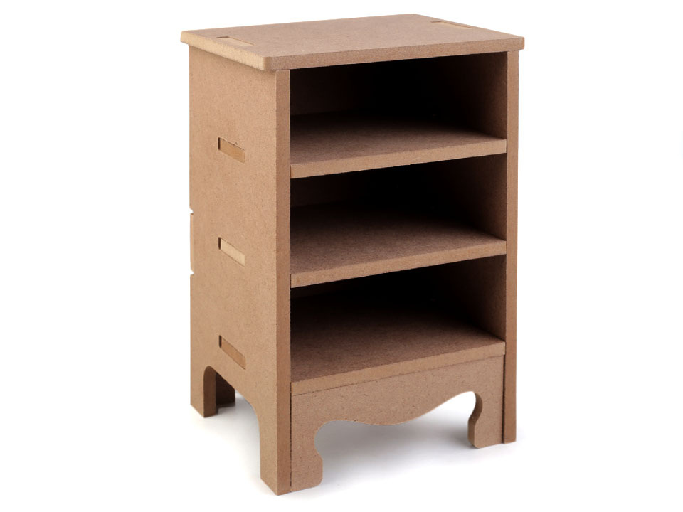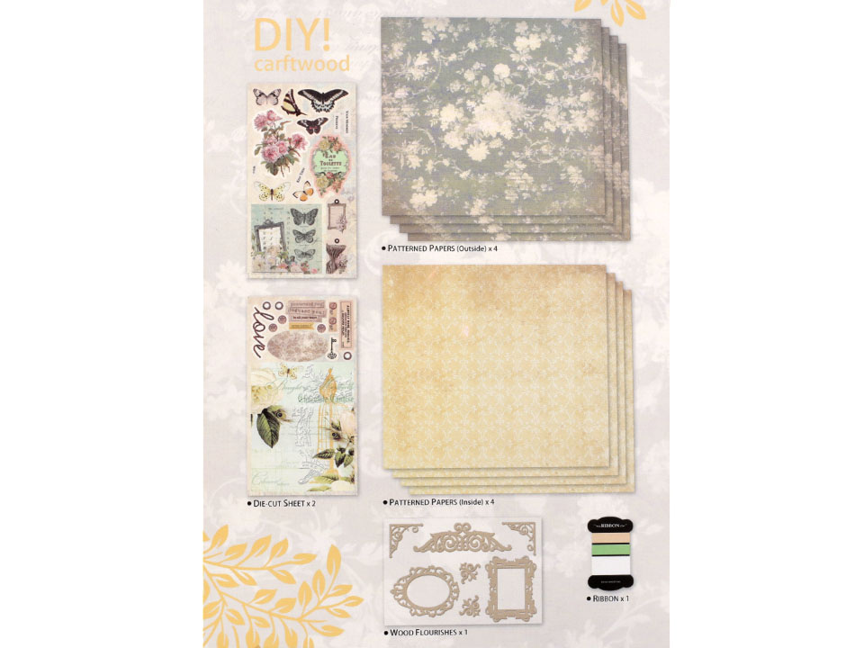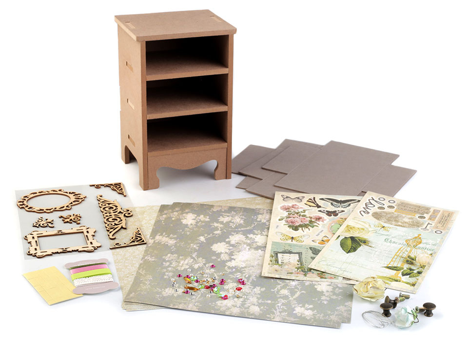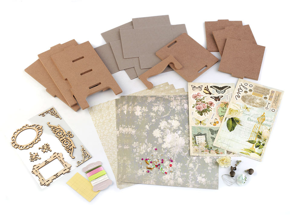 Všechny potřebné části najdete uvnitř balení. Samotné tělo šperkovnice je z pevného lisovaného kartonu s dřevotřískou, který se svou houževnatostí vyrovná tvrdému dřevu. Slepenou šperkovnici dozdobíte podle své fantazie přiloženými doplňky.