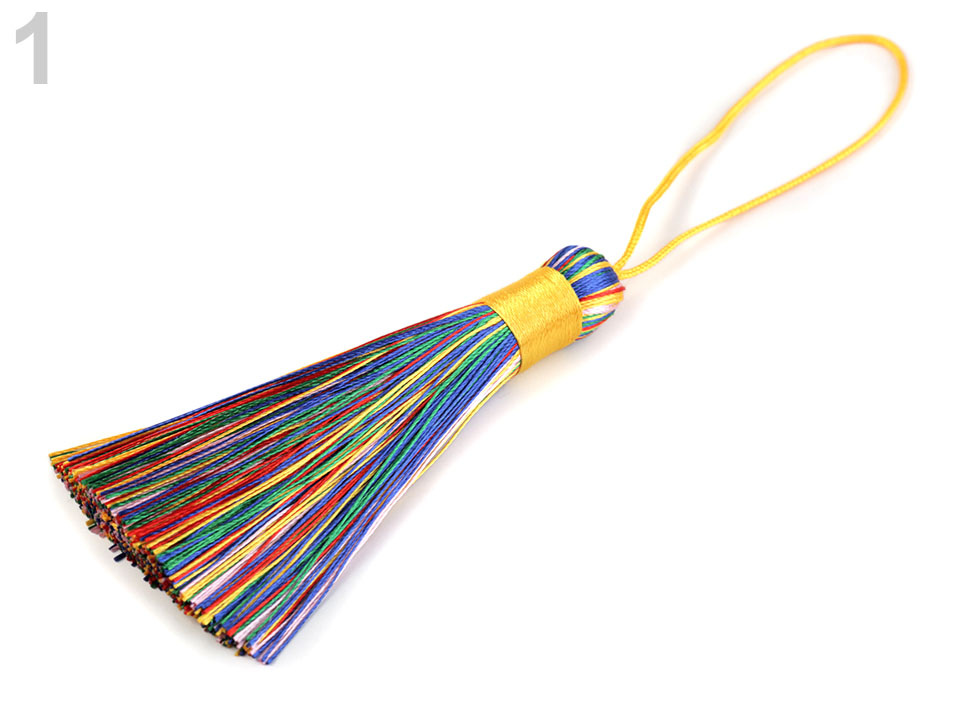 Ozdobný střapec je vyrobený z lesklých přízí. Má poutko, díky kterému ho můžete kamkoli připevnit.