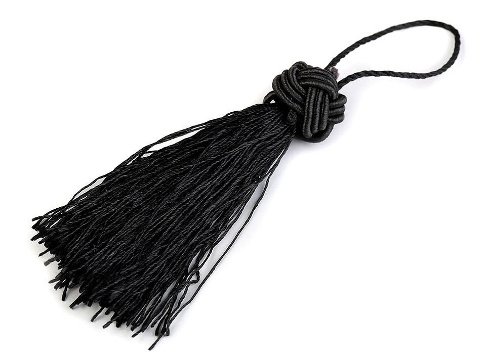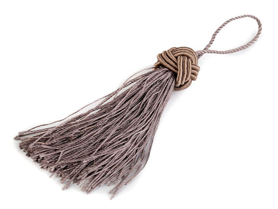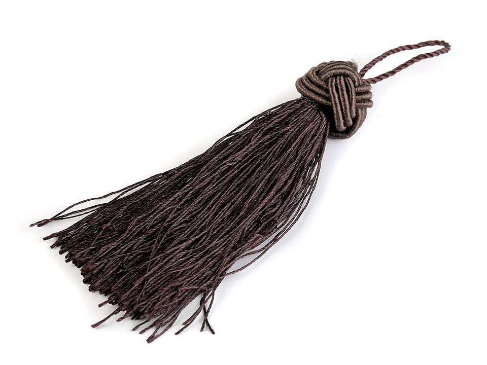 Střapec je vyrobený z lesklých přízí a ve vrchní části má ozdobný uzel. Díky poutku ho můžete kamkoli připevnit.