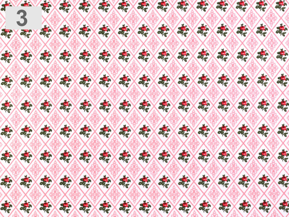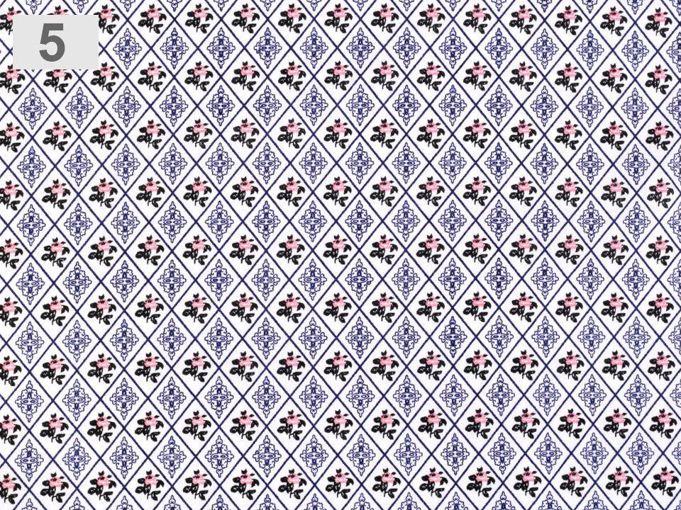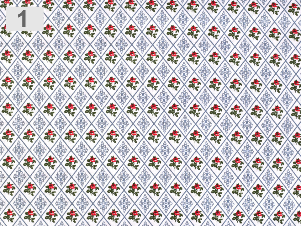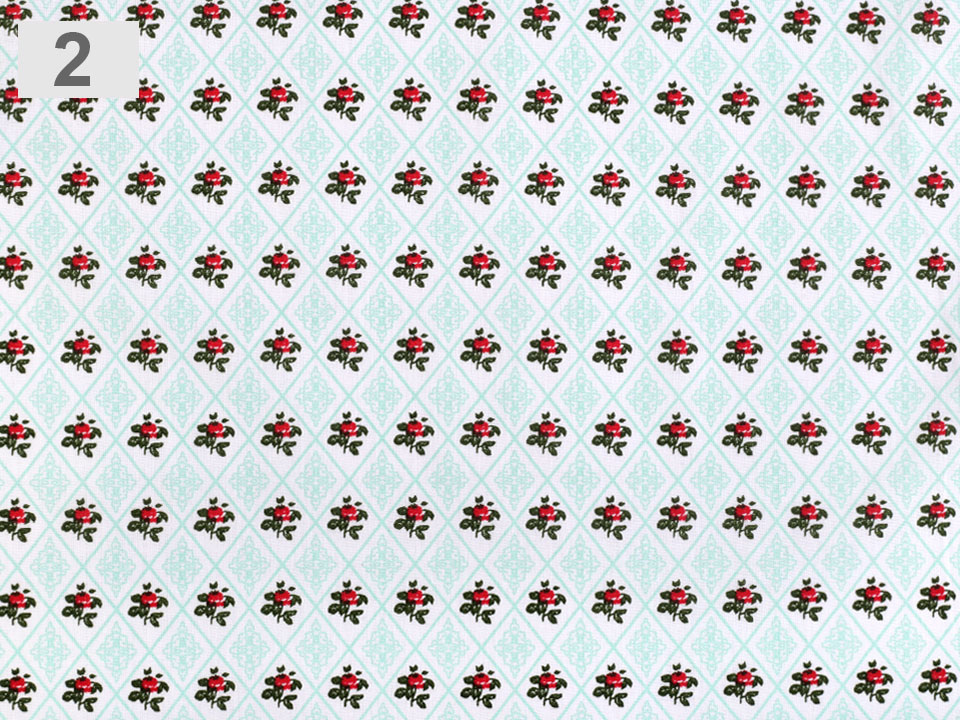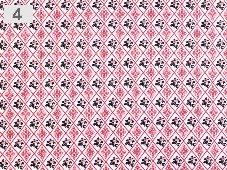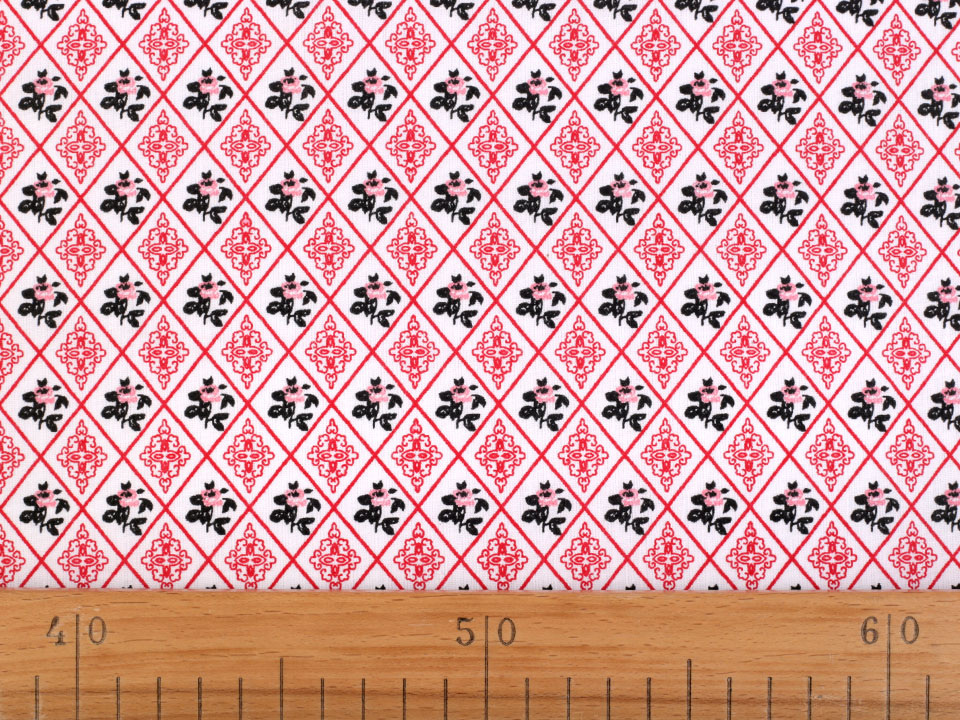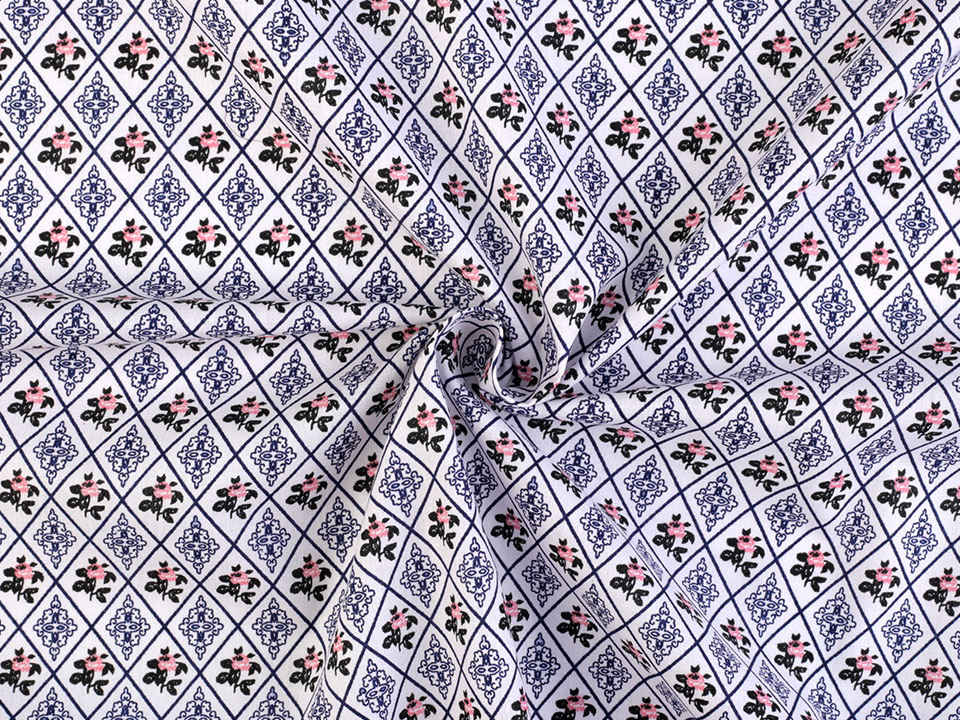 Bavlněná látka má design s kosočtverci, které v sobě ukrývají drobné růžičky a ornamenty.