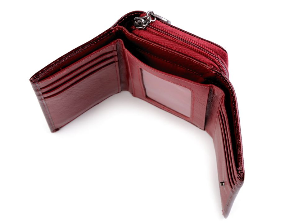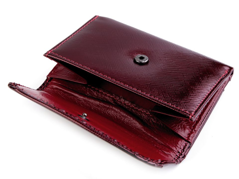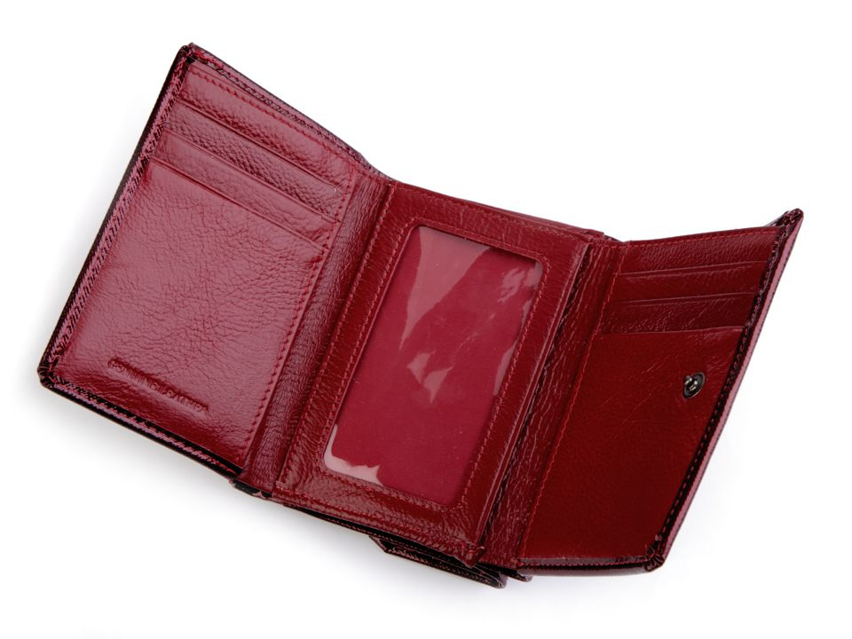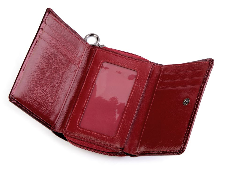 Peněženka č.1 a 2 má uzavírání na patent, 8 přihrádek na kreditní karty, 1 průhlednou přihrádku na doklady a 2 přihrádky na bankovky. Mincovník z druhé strany se také zapíná na klopu s patentkou. Rozměry: 8 x 11,5 x 3,5 cm.