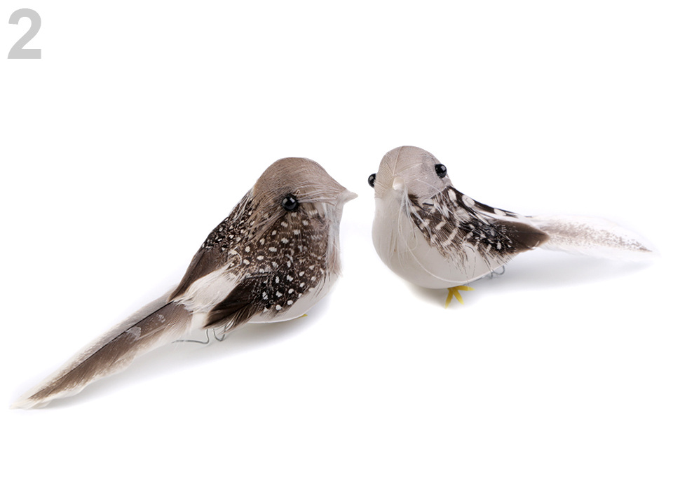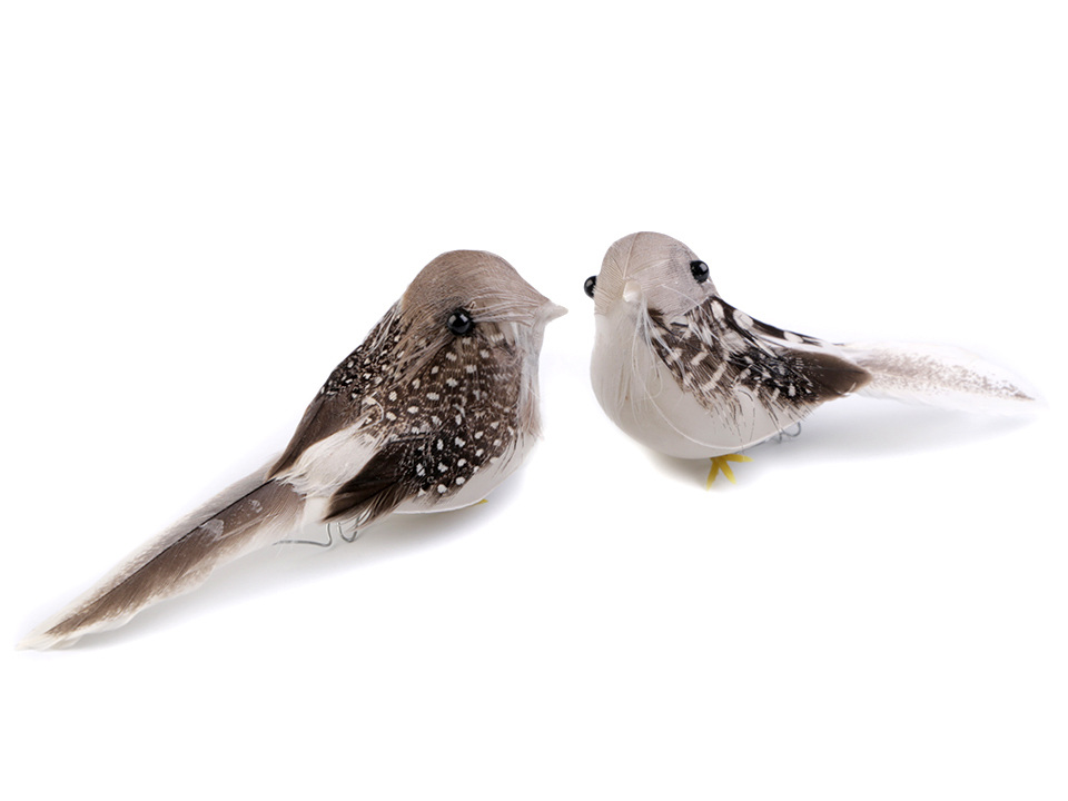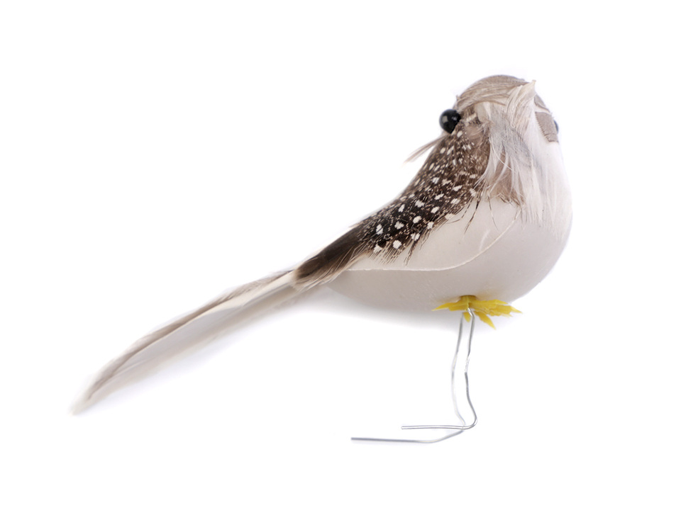 Dekorační ptáček je pokrytý peřím. Na nohách má připevněné dva kovové drátky, díky kterým můžete ptáčka připevnit na věnec, větvičku, záclonu nebo ho naaranžovat do květinových vazeb.