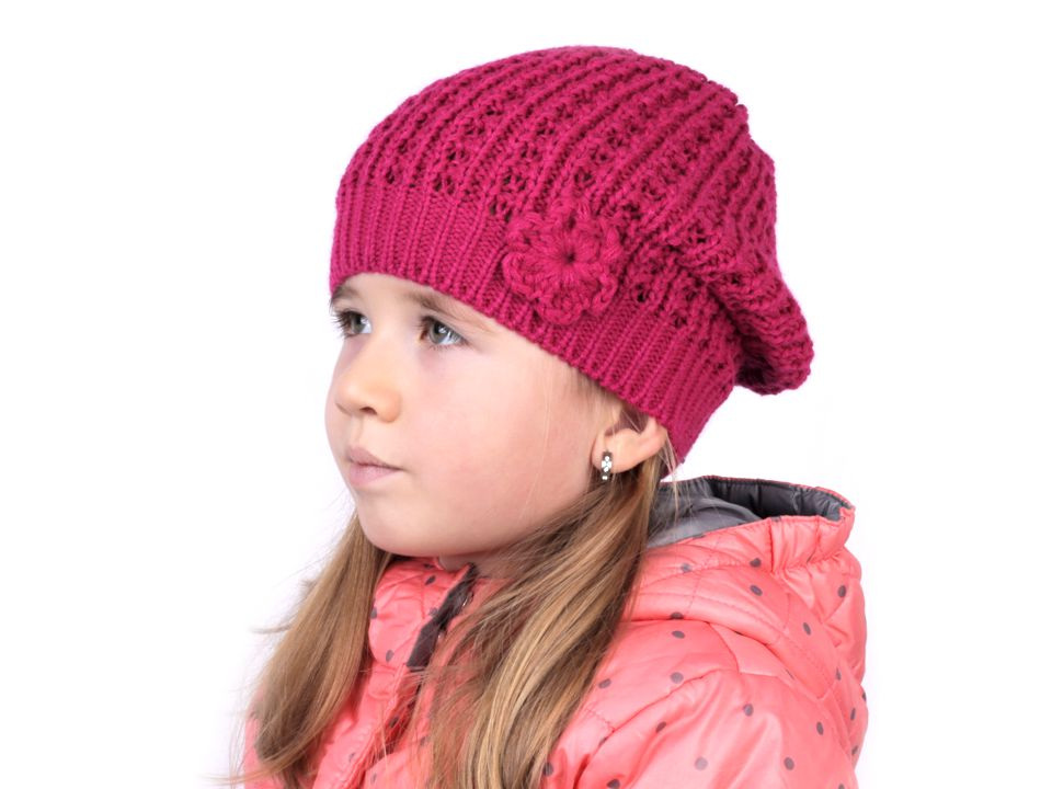 Dívčí pletená čepice Capu je ozdobená háčkovanou květinou. Pletenina má zajímavou strukturu, je vyrobená z příjemného, měkkého materiálu. Okraj čepice je zpevněný pruženkou, dobře drží, nesklouzává.