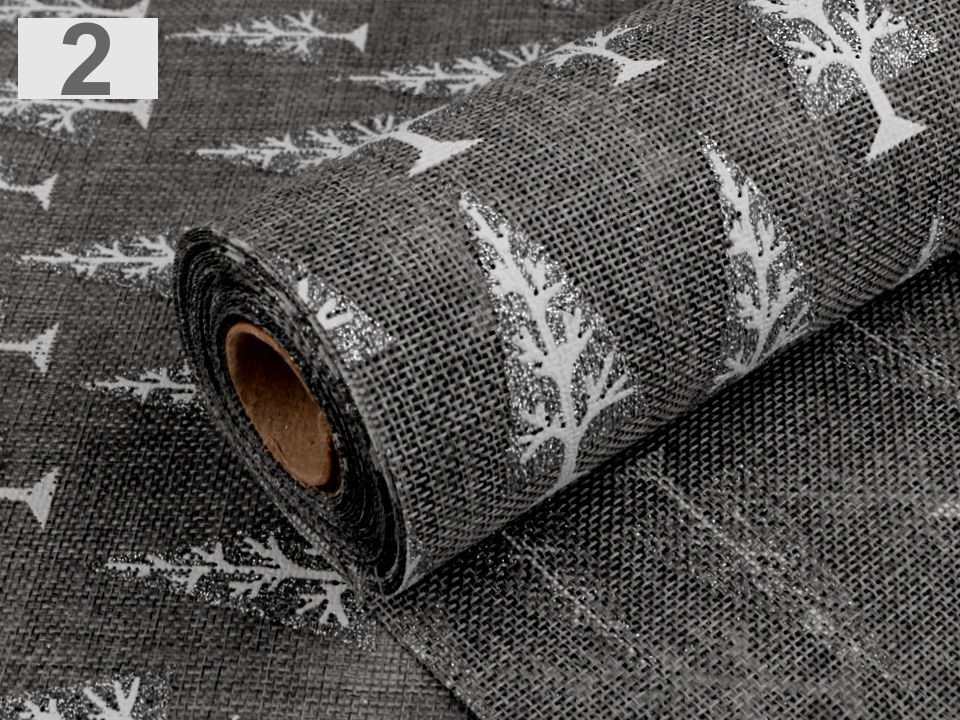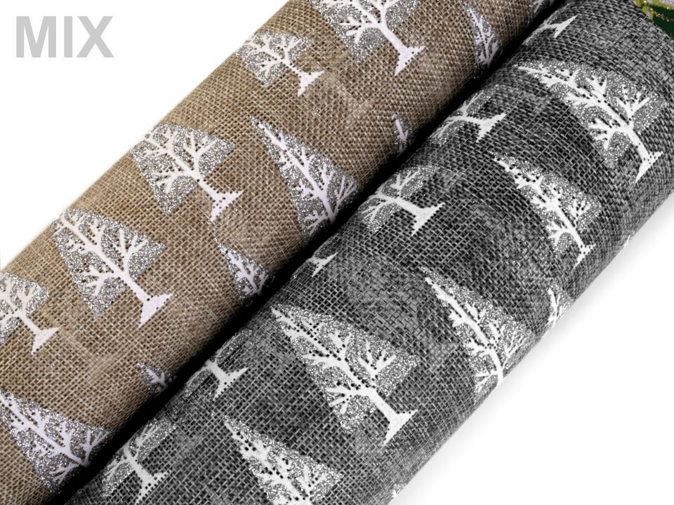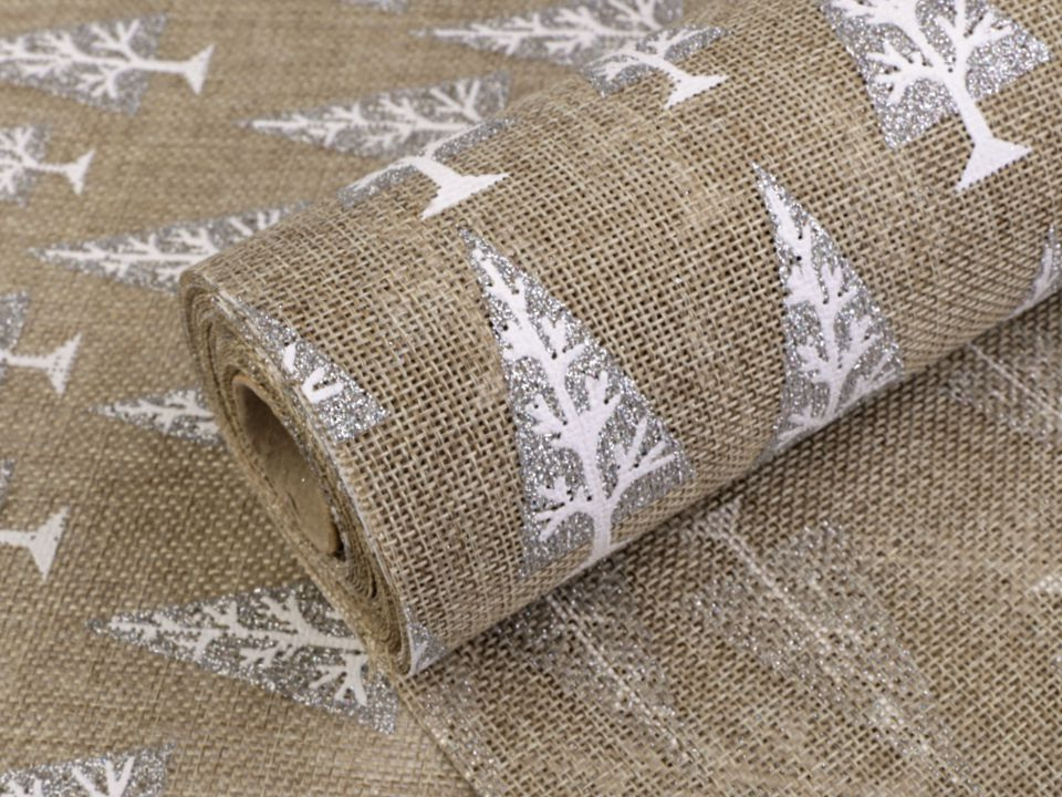 Imitace juty zaujme svým potiskem stromů, které se díky glitrům třpytí. Textilie není obšitá.