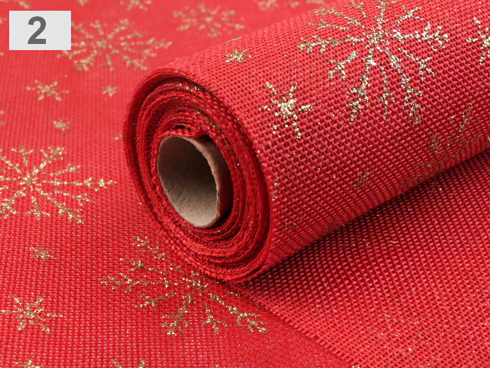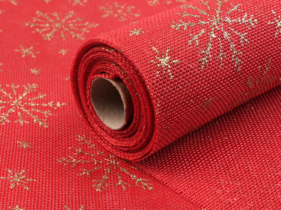 Imitaci juty zdobí potisk vloček z glitrů, které mají jemný třpyt. Textilie není obšitá.