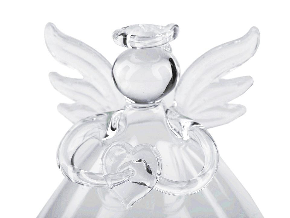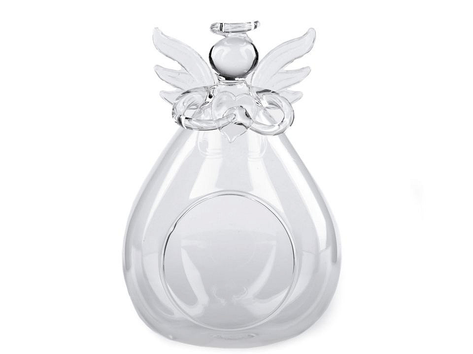 Skleněný anděl ozdobí každý interiér. Má v sobě otvor, do kterého naaranžujete peří nebo oblíbené sukulenty. Díky plochému dnu má anděl dobrou stabilitu. Můžete ho i zavěsit do prostoru.