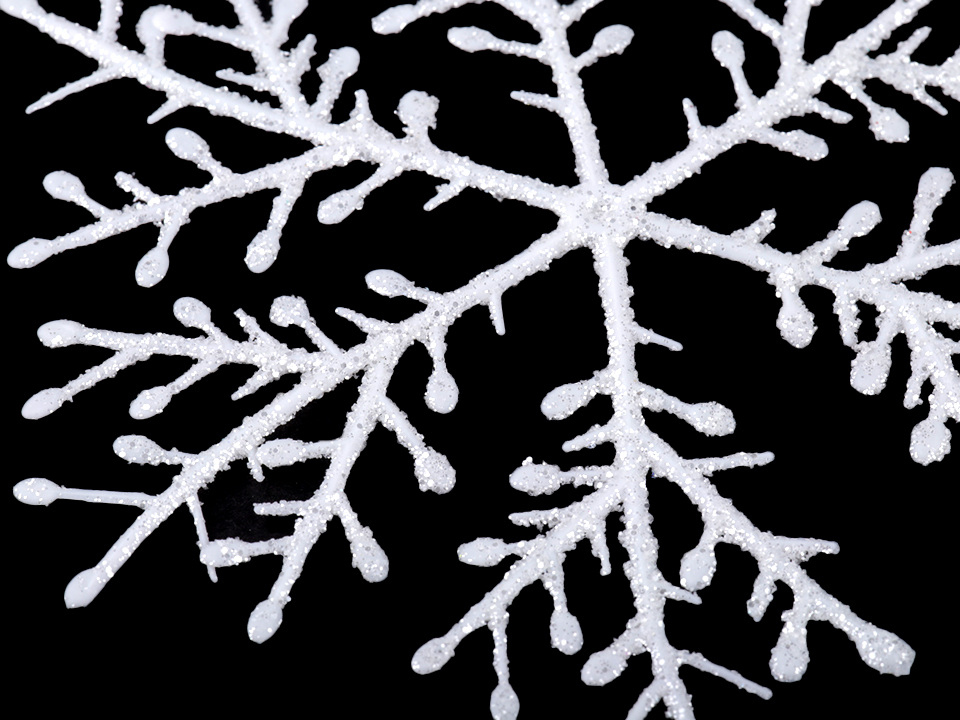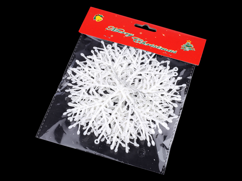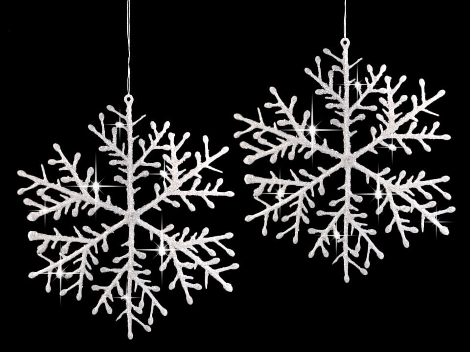 Dekorační vločky působí křehce. Jsou lehké a poseté třpytivými glitry. Mají u sebe lurexový provázek, za který je můžete pověsit na stromeček, do oken nebo na věnec.