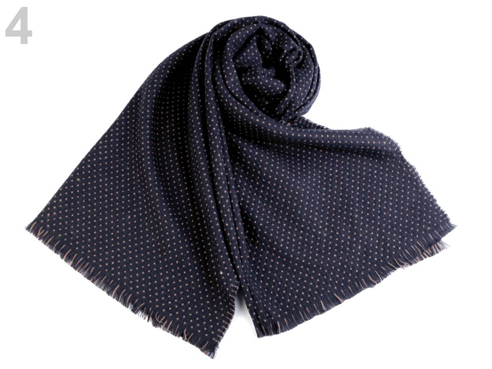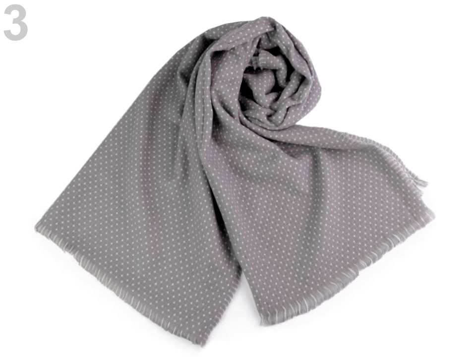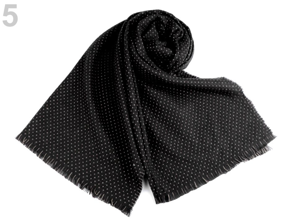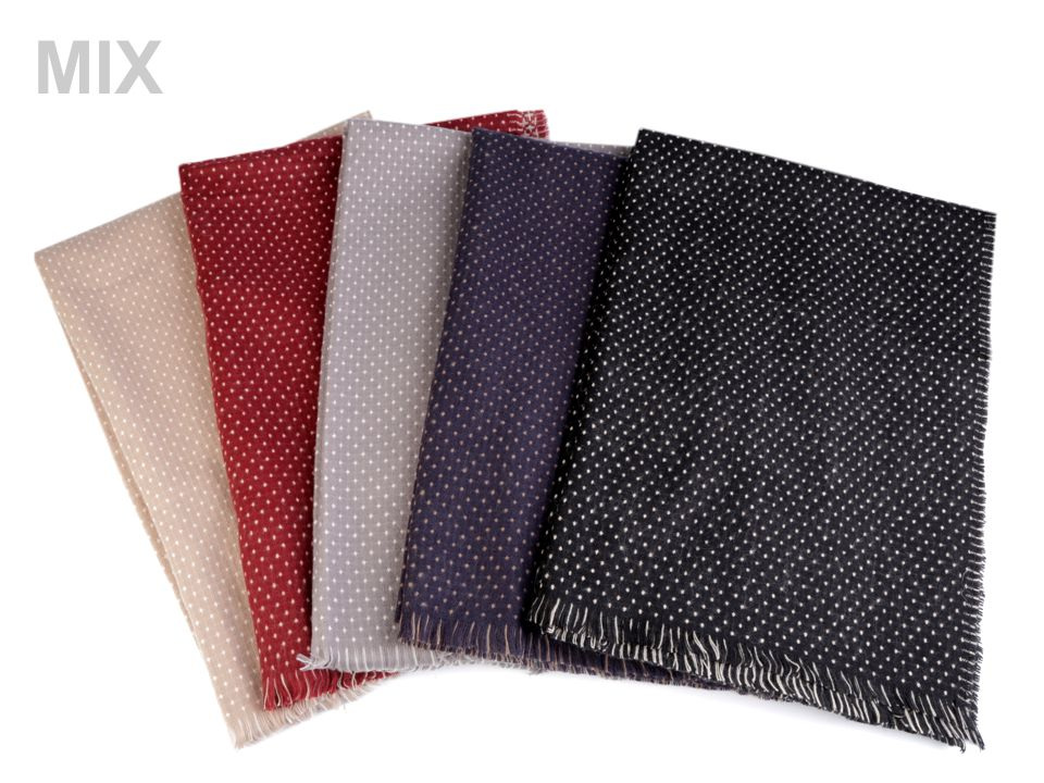 Je oboustranná, z jedné strany je tmavší se světlými puntíky, na druhé straně je světlejší s křížkovým vzorem. Je vyrobená z příjemně měkkého materiálu. Hodí se ke kabátu, bundě i svetru. Na koncích je zakončená jemnými třásněmi.