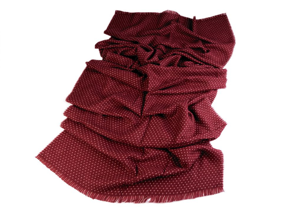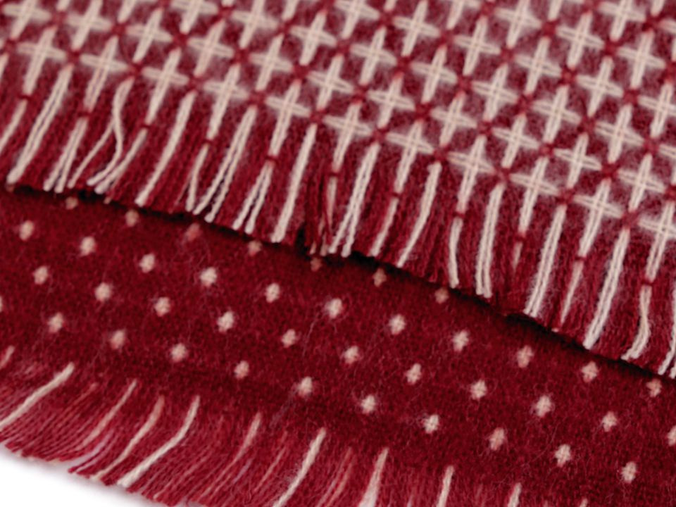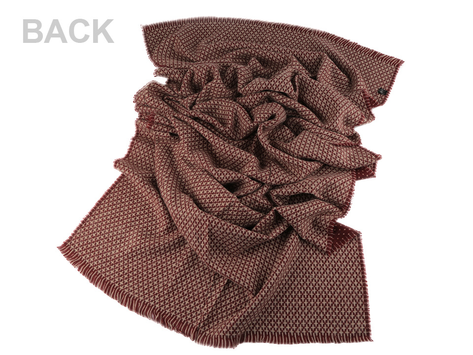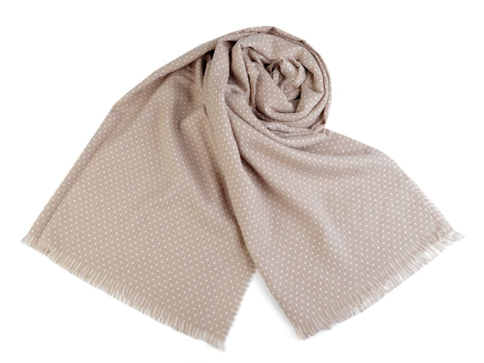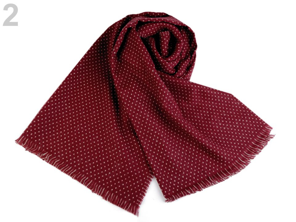 Je oboustranná, z jedné strany je tmavší se světlými puntíky, na druhé straně je světlejší s křížkovým vzorem. Je vyrobená z příjemně měkkého materiálu. Hodí se ke kabátu, bundě i svetru. Na koncích je zakončená jemnými třásněmi.