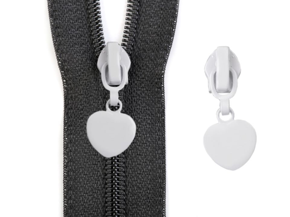 Kovový jezdec má táhlo v podobě srdíčka. Je určený ke spirálovým zipům o šíři 5 mm v metráži, které u nás najdete pod odkazem: