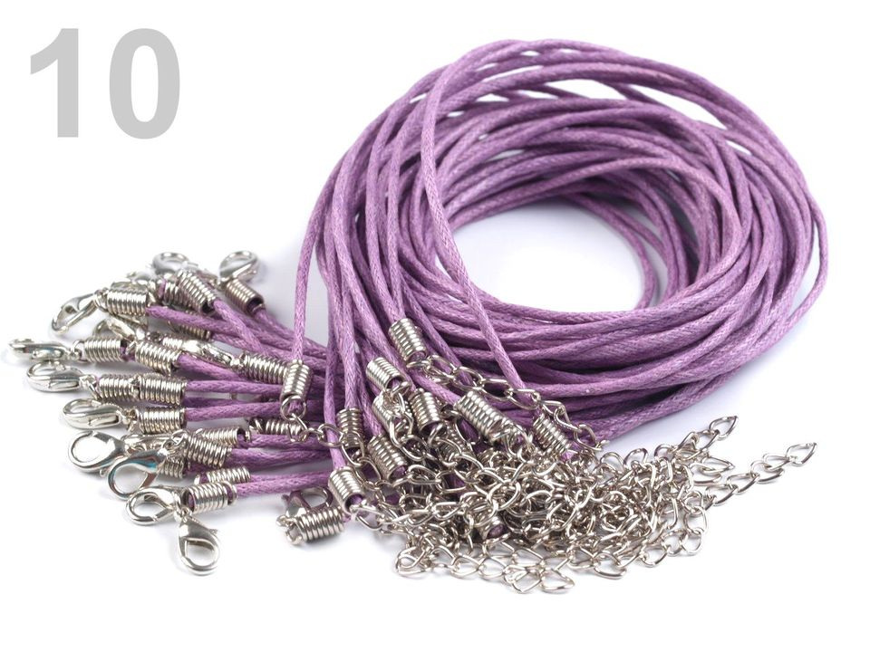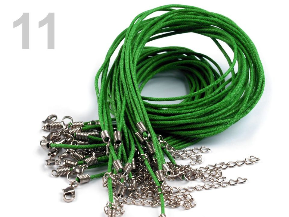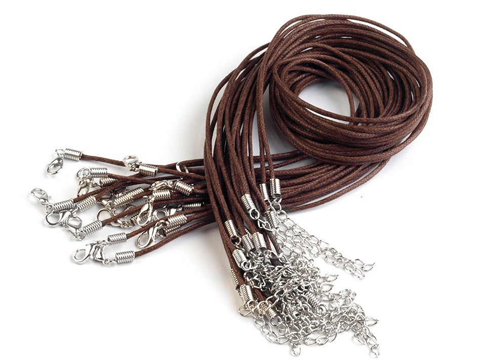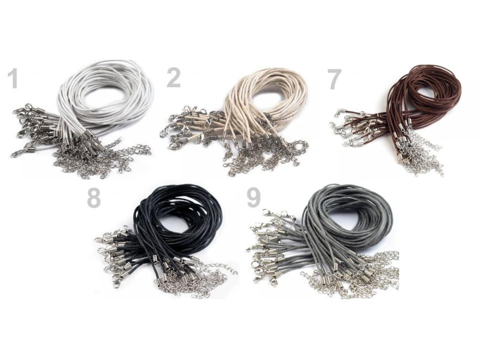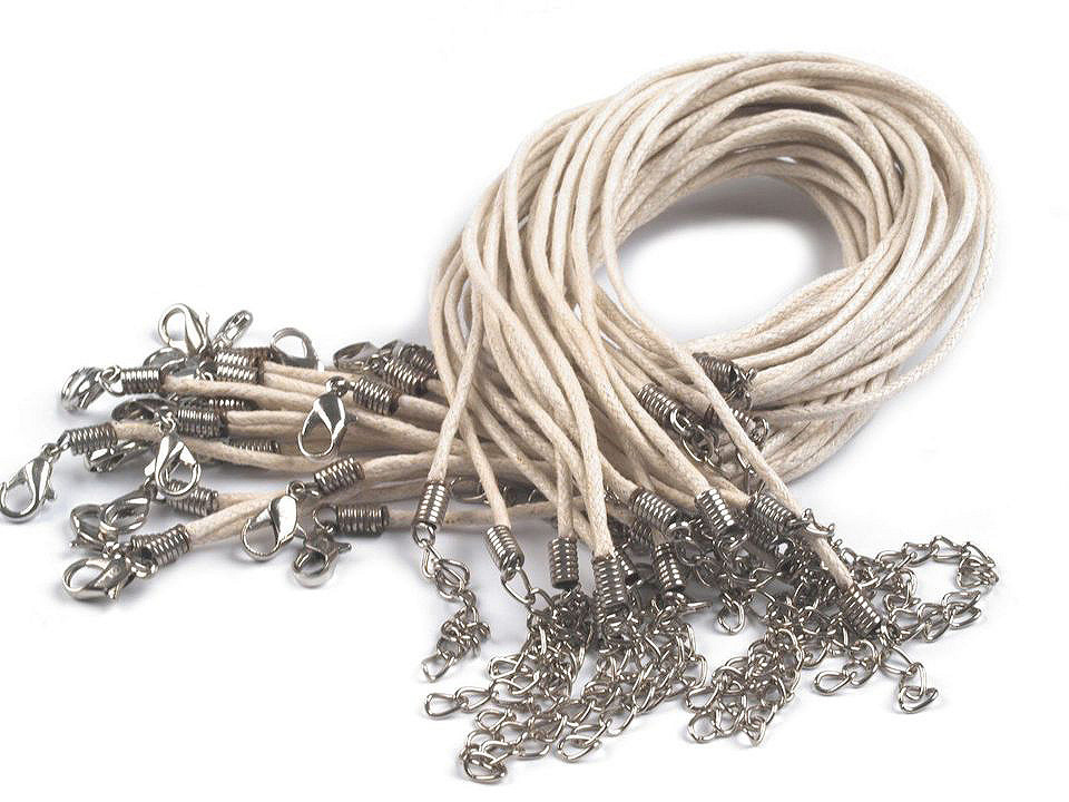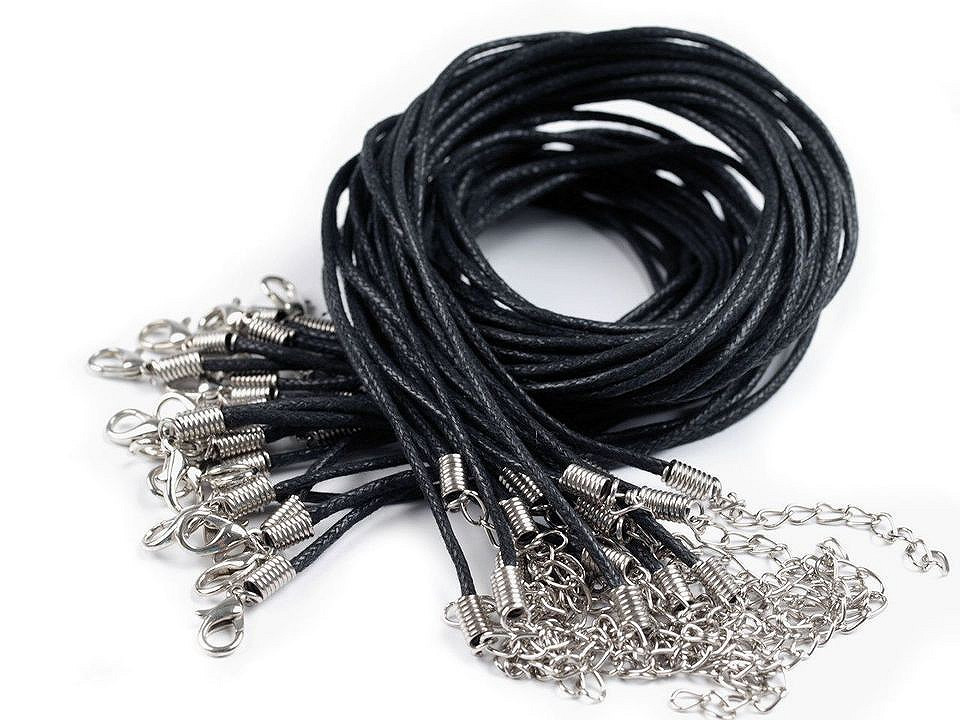 Bavlněné šňůrky, které jsou povrchově ošetřené voskováním. Jsou ve veselých barvách a s hotovým připevněným zapínáním. Stačí pouze navléct přívěsek a vyrazit. Samozřejmostí tohoto hotového výrobku je prodlužovací řetízek. Délka 45 cm + 5 cm adjustační řetízek. Karabinka 5 x 10 mm, šňůra průměr 1 mm.