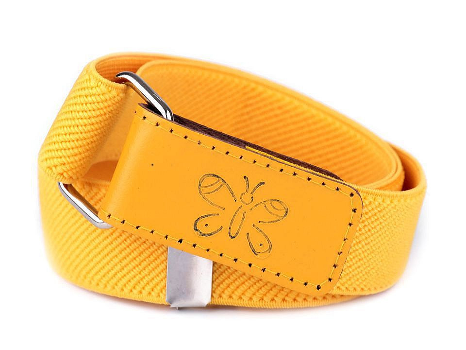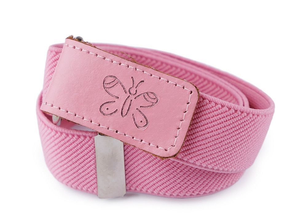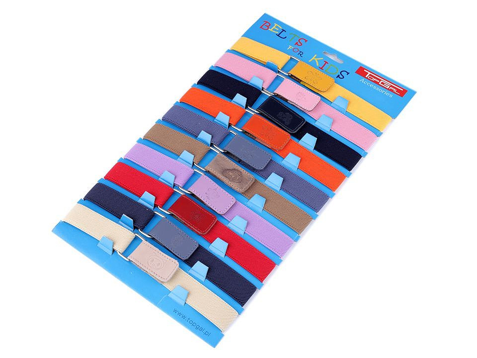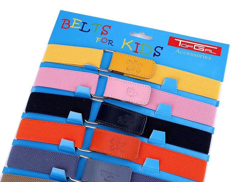 Pásek pro děti v mnoha barevných provedeních. Pásky měří volně položené v nejmenší délce 35 cm, v nejdelší 65 cm. Jsou elastické, dají se posouvat podle obvodu pasu dítěte, zapínají se na suchý zip.