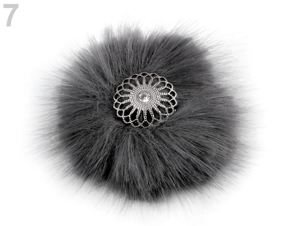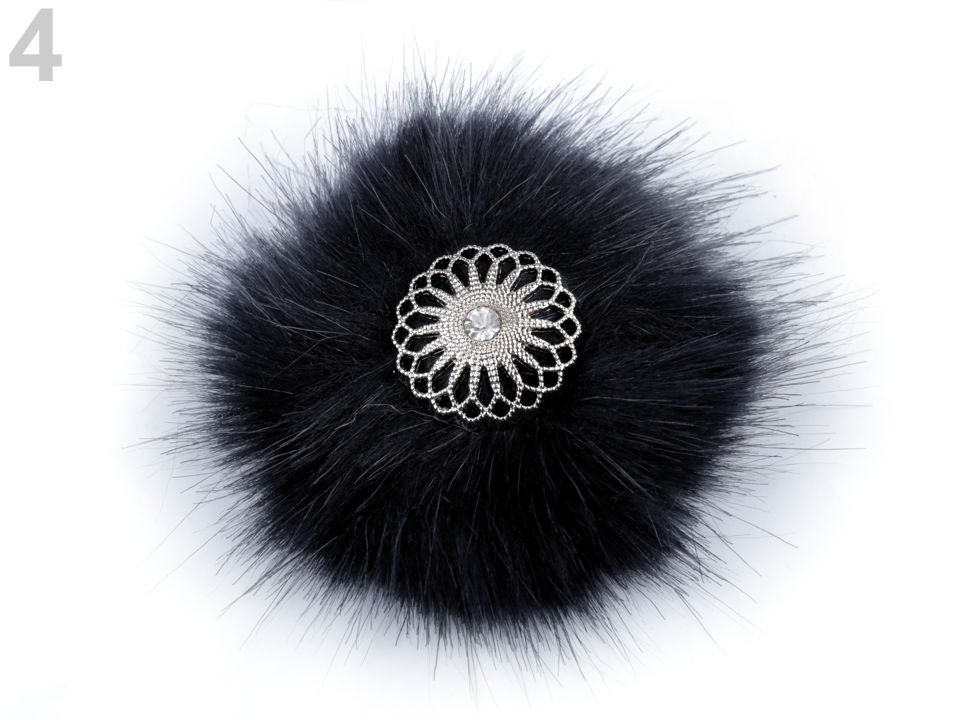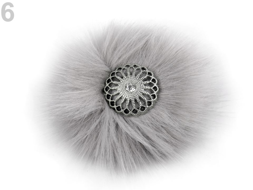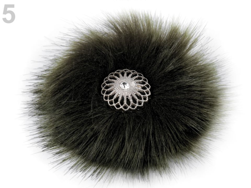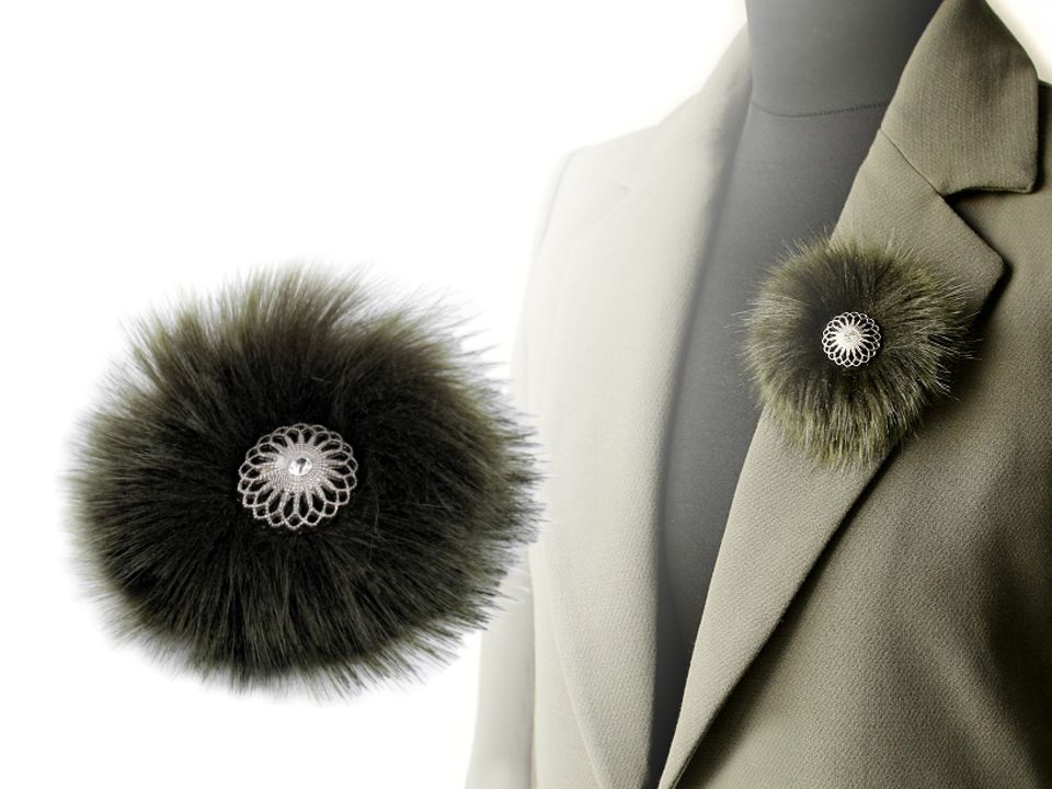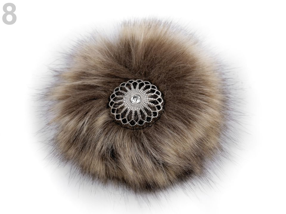 Kožešinová ozdoba nadchne všechny příznivce těchto střapatých ozdob. Vrchní část zdobí kovová ozdoba s broušeným kamínkem uprostřed, který se krásně třpytí. Ozdoba je k bambuli pevně přišita. Ve spodní části kožešinové ozdoby je patent, kterým ji můžete připevnit k oblečení. Celá kožešinová bambule tak působí jako originální brož.