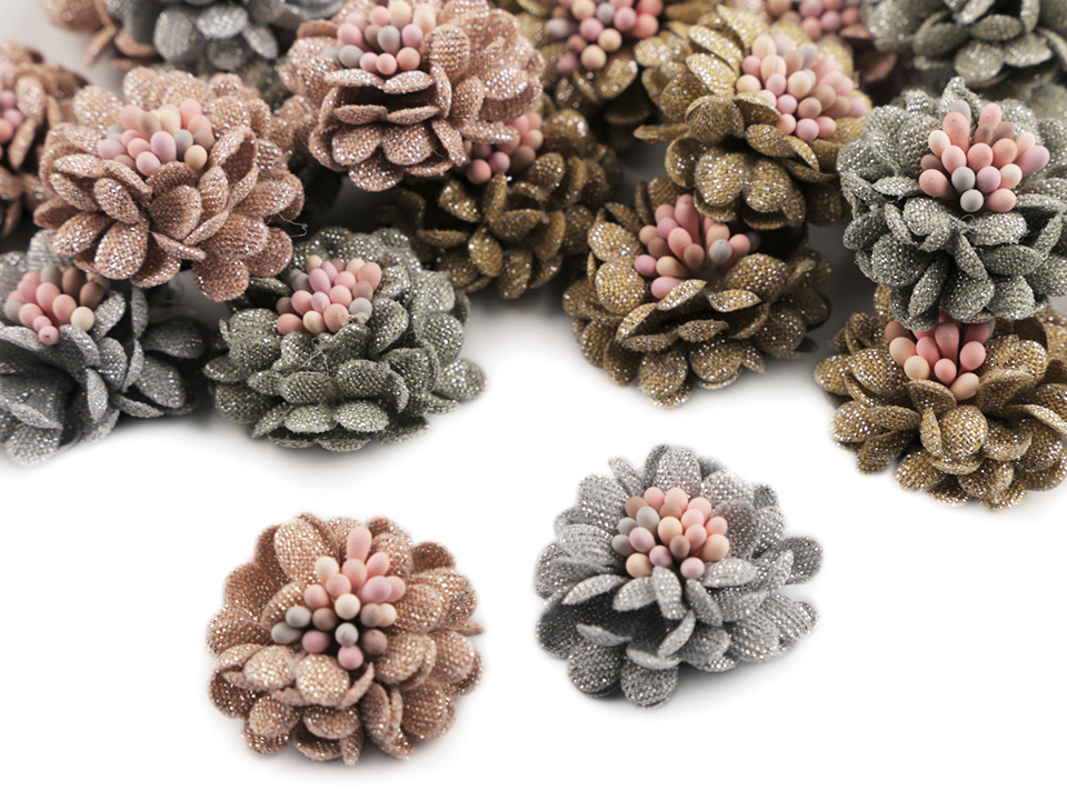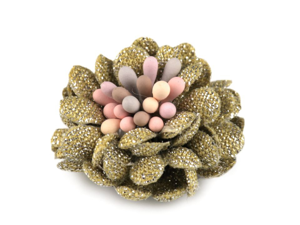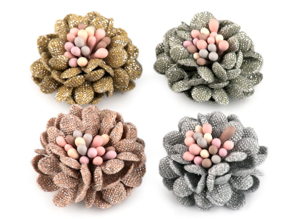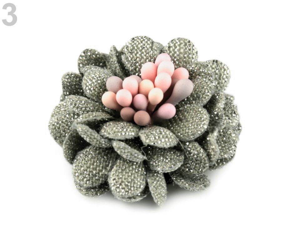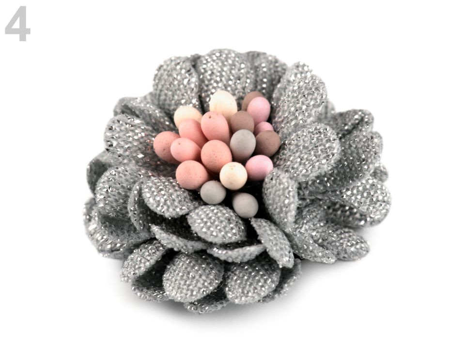 Dekorační květ se čtyřmi vrstvami okvětních lístků je uprostřed zdobený pestíky. Květ se půvabně třpytí díky jemným lurexovým vláknům, kterými jsou lístky protkány. Jeho decentní vzhled oživí nejen vaše oblečení, ale také klobouky, kabelky či boty. Další využití najdete při výrobě čelenek, věnečků do vlasů nebo broží.