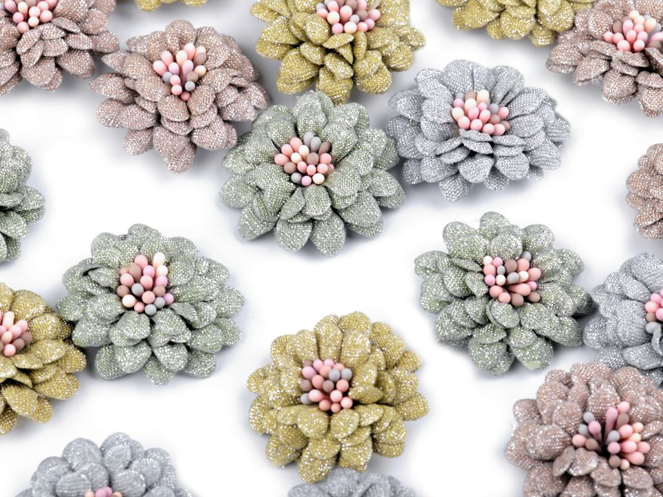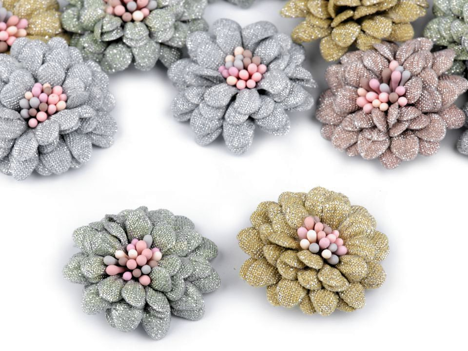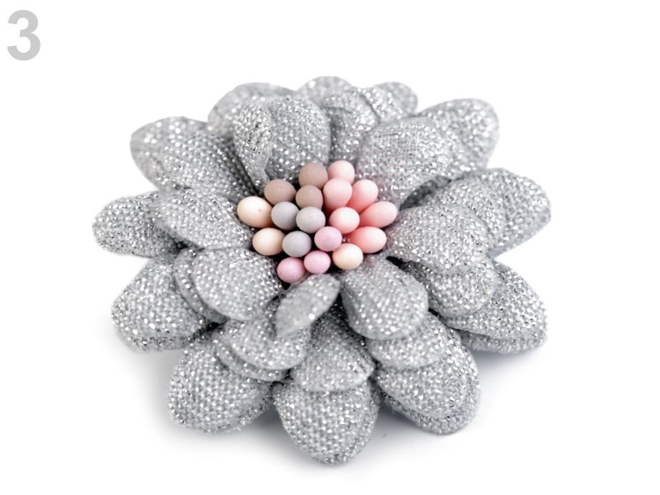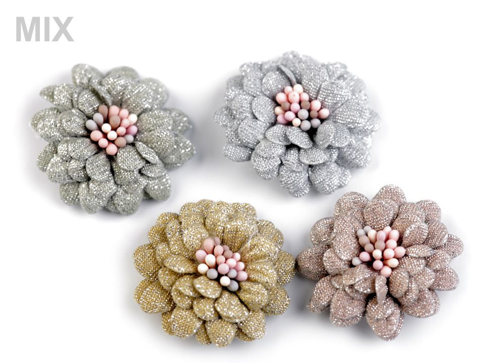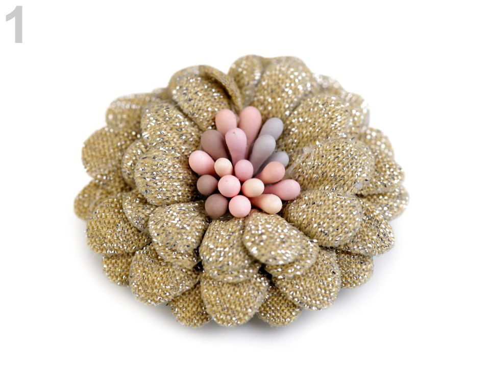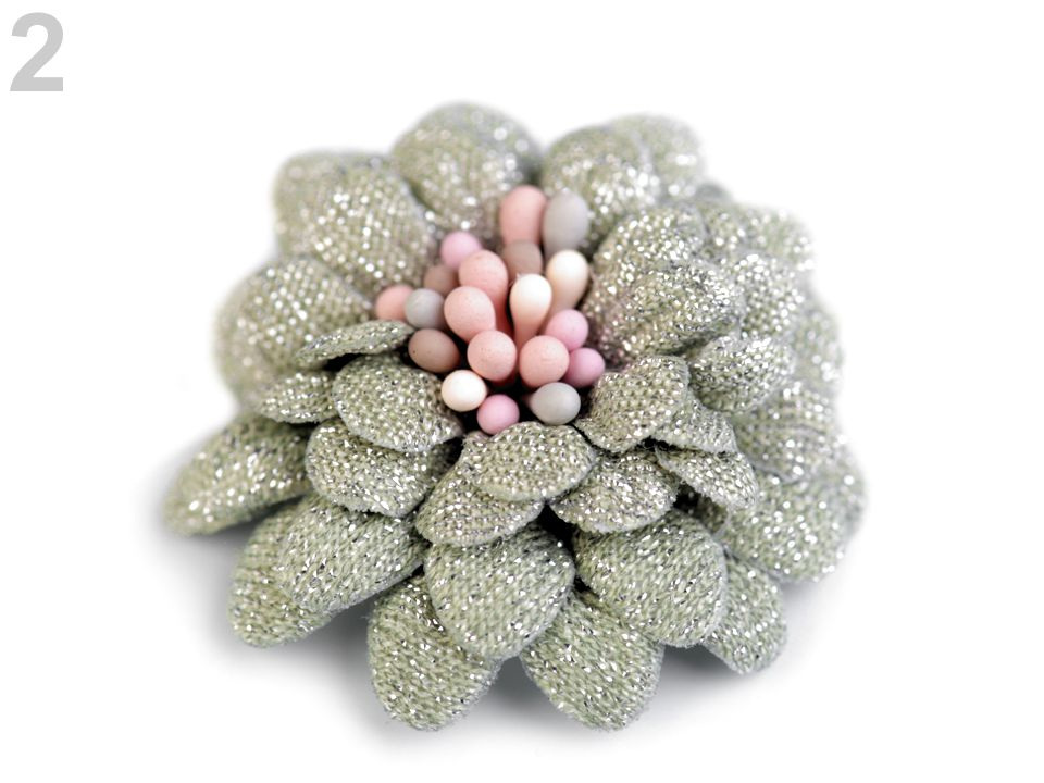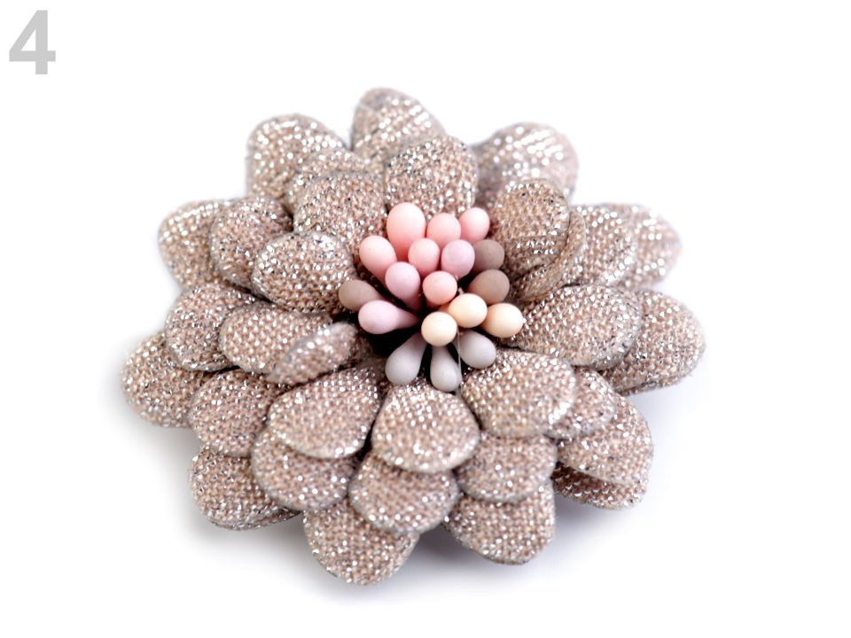Čtyřvrstvý dekorační květ je uprostřed zdobený pestíky, díky nimž vypadá jako živý. Je protkaný jemnými lurexovými vlákny, díky nimž se poutavě třpytí.