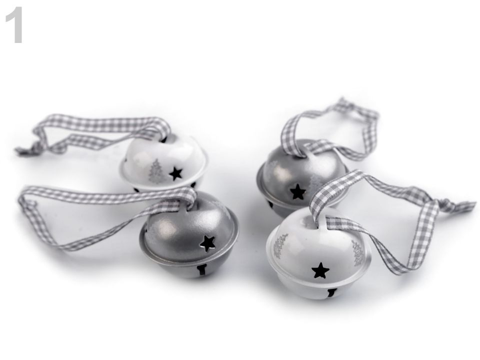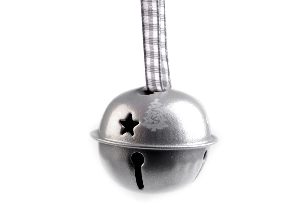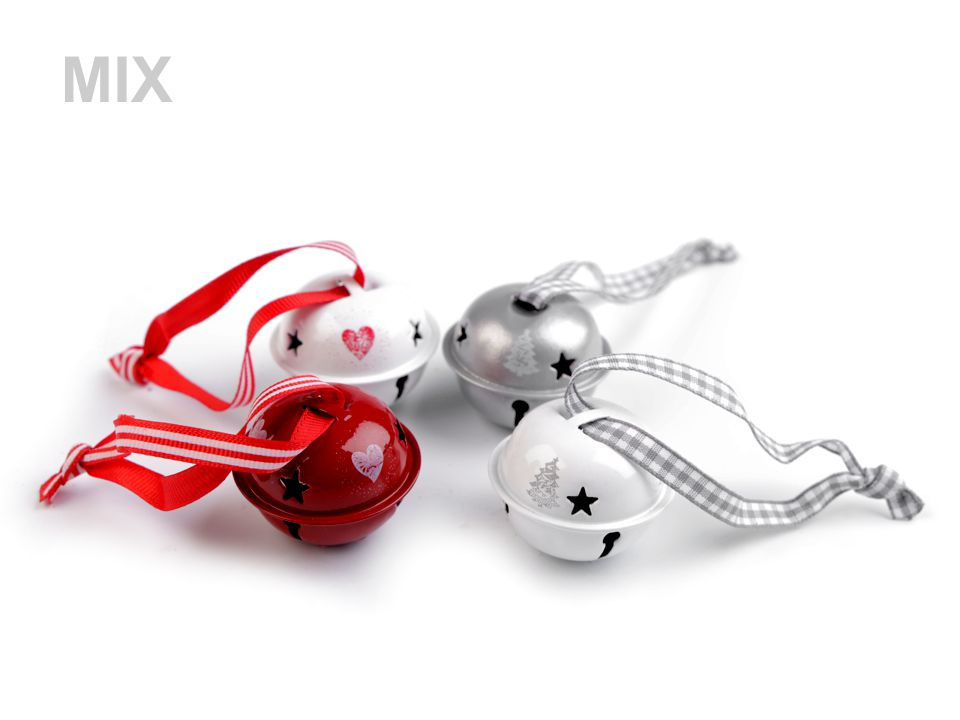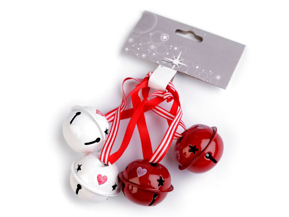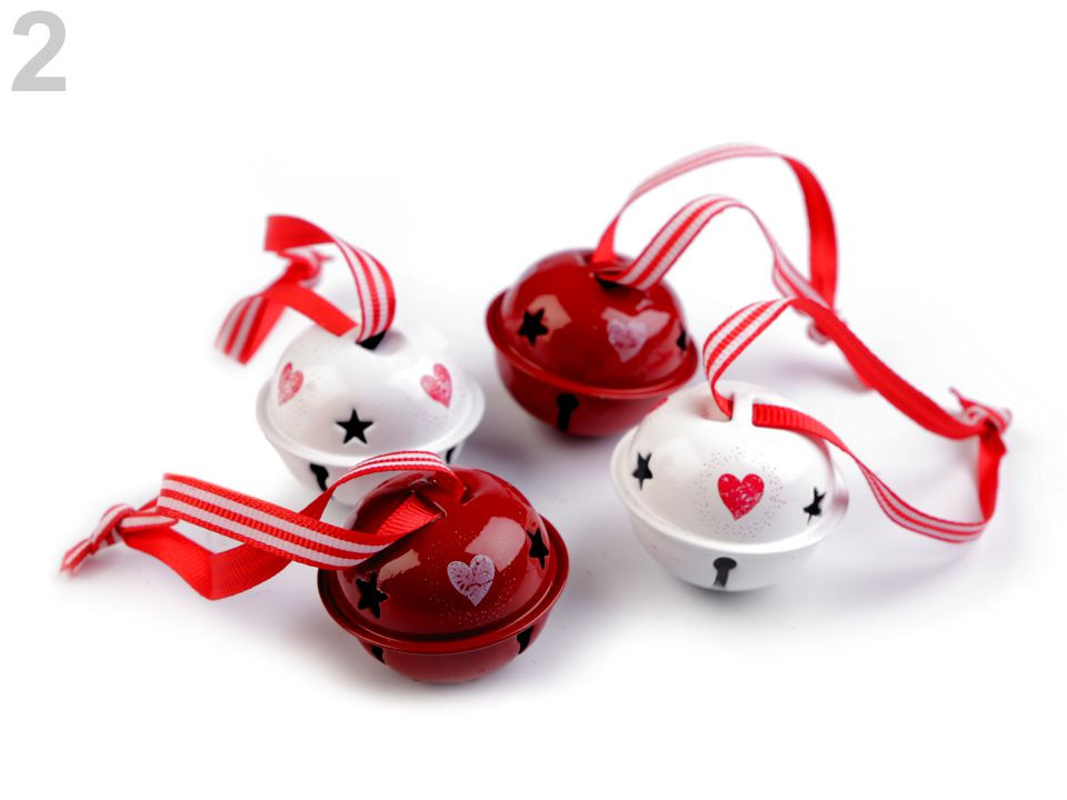 Kovové rolničky jsou ozdobené potiskem srdíček nebo stromečků. Díky poutku ze stuhy je může pohodlně zavěsit.