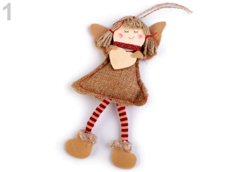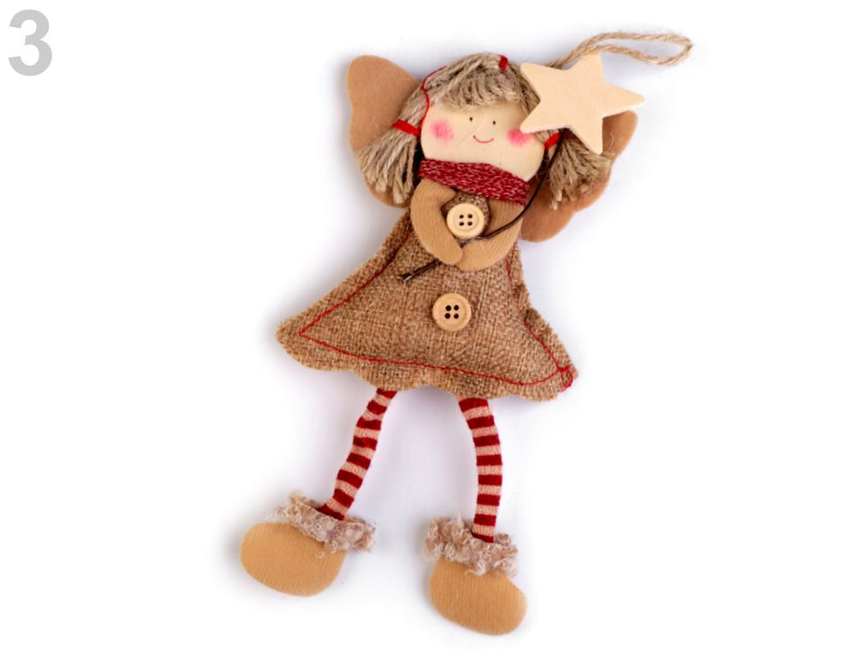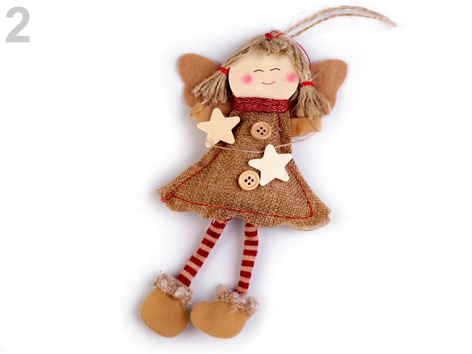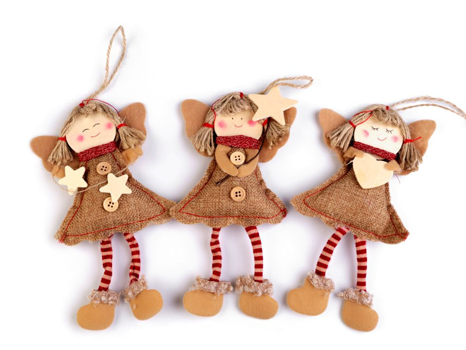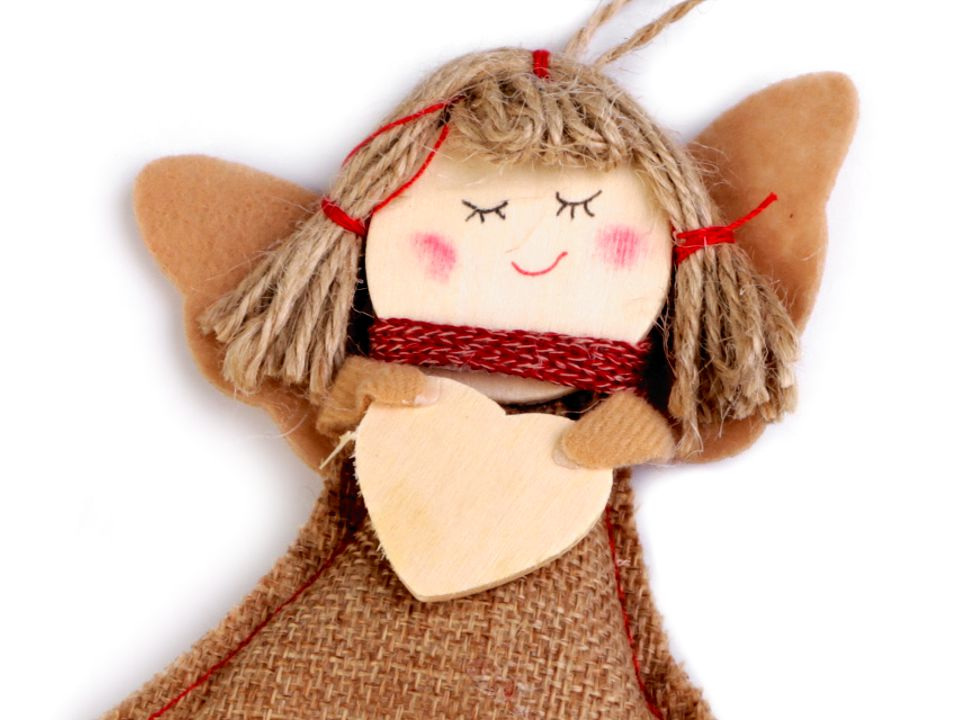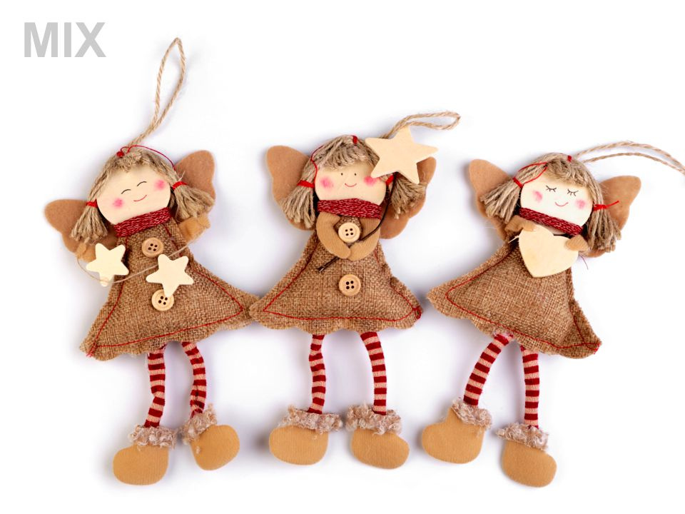 Dekorační anděl zútulní váš interiér nejen během zimních svátků. Má na sobě hravé detaily v podobě knoflíků, pruhovaných punčoch nebo šály kolem krku. Za jutové poutko ho můžete pověsit na stromek, na dveře či do oken.