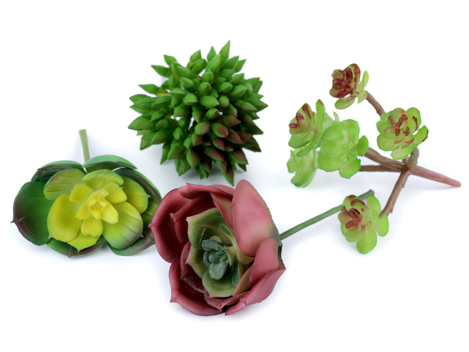 Sukulent č.1 a 2 má ve stonku drát, můžete jej tvarovat nebo k něčemu připevnit omotáním. Sukulent č.3 a 4 má pevný stonek vhodný k zapíchnutí.