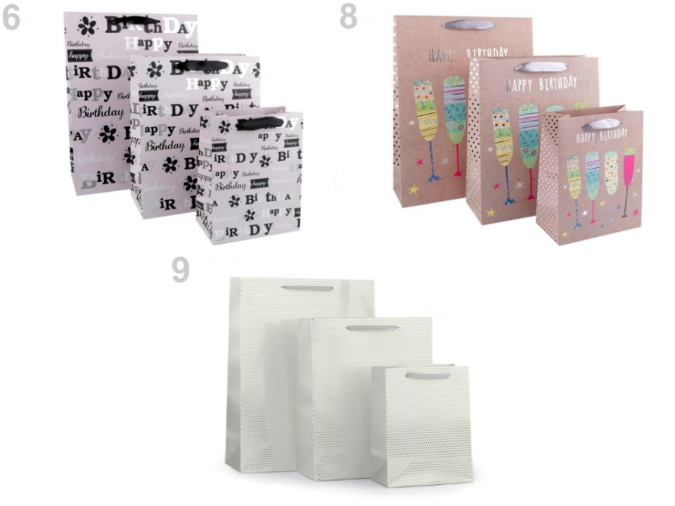 Do sady tří luxusních dárkových tašek zabalíte jakékoliv dárky. Tašky jsou pevné, vyrobené z kvalitního křídového papíru. Některé detaily mají zvýrazněné metalickým efektem.