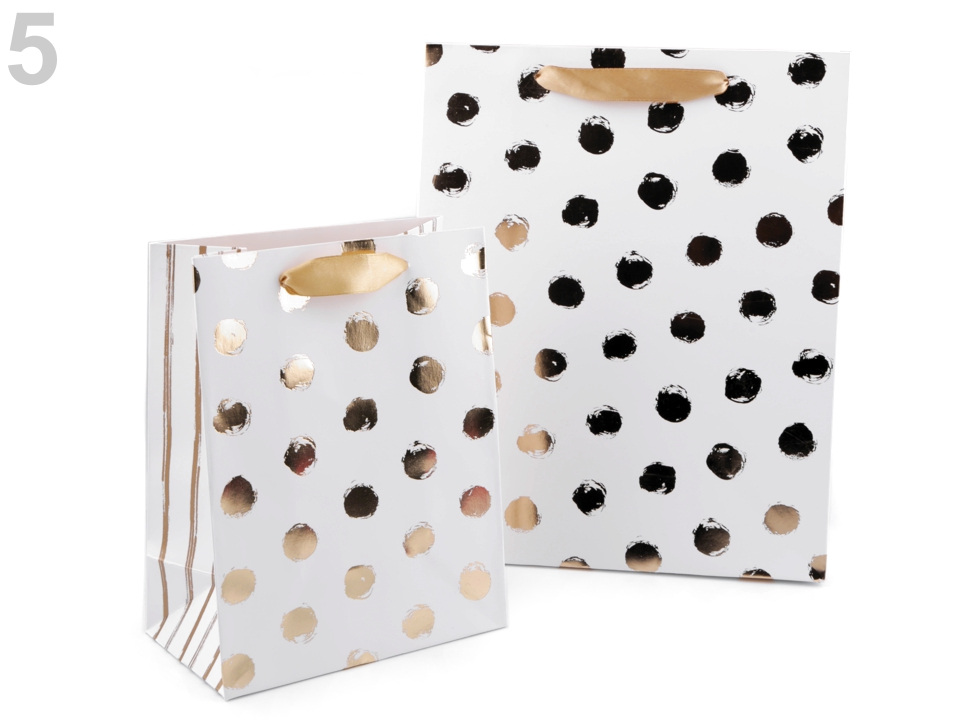 Sadu střední a malé dárkové tašky zdobí potisk. Některé motivy jsou zvýrazněné metalickou barvou, která se leskne. Využijete je na rychlé a vkusné zabalení dárků. Jsou z pevného křídového papíru.