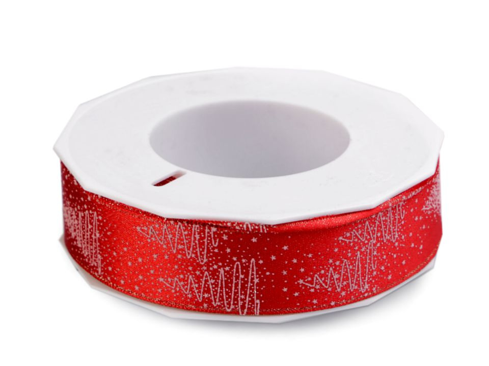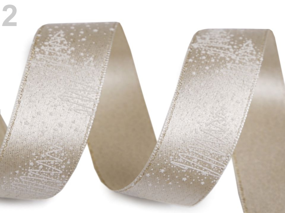 Dekorační saténová stuha s potiskem zasněžených stromečků se díky přidaného lurexu jemně třpytí. Potisk je jednostranný.