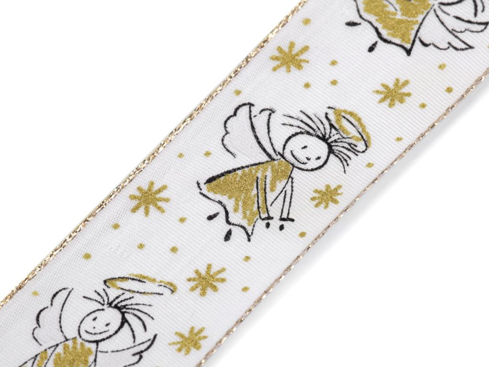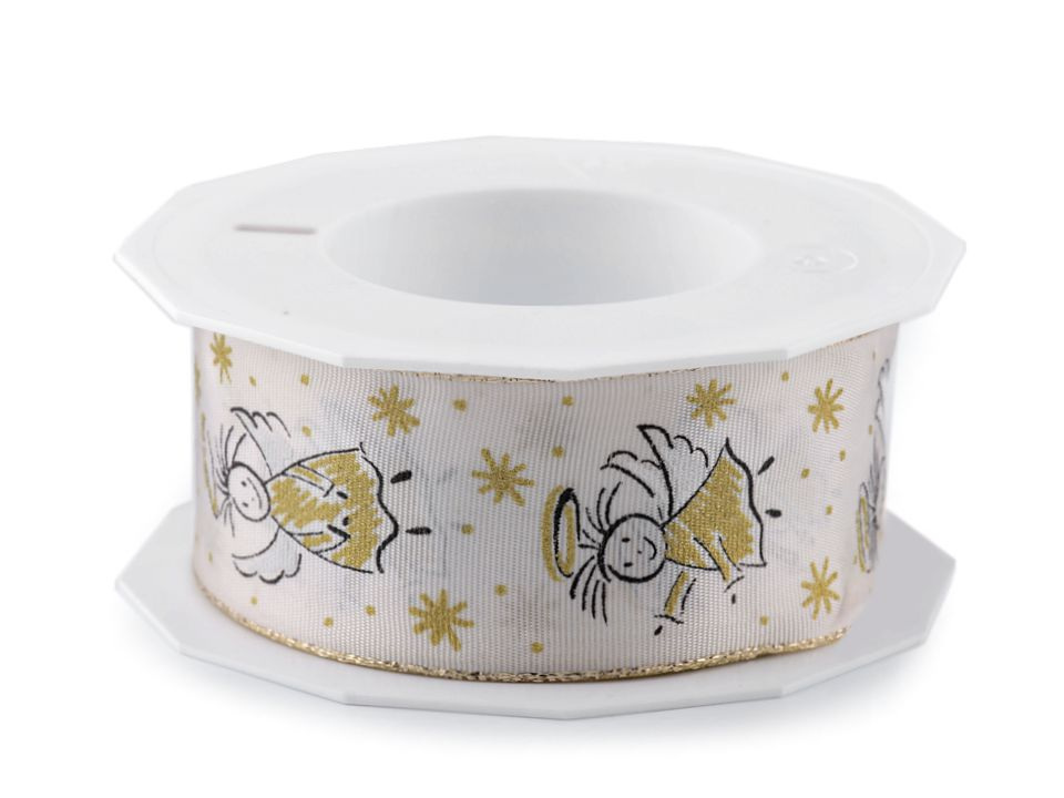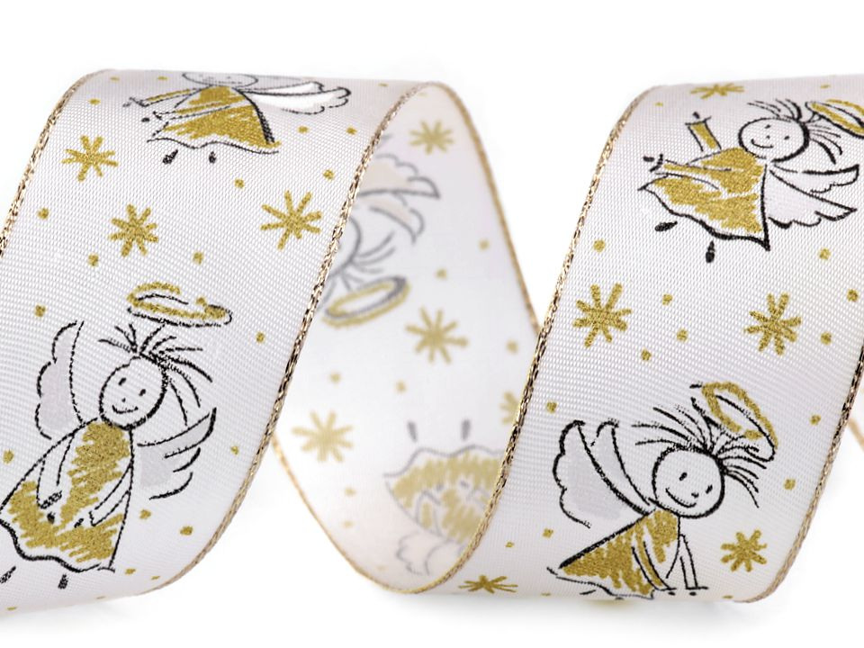 Dekorační stuha s motivem andílků vyniká precizním, detailním potiskem. Díky drátkům po stranách perfektně drží tvar při aranžování. Lurex na boku i v potisku se jemně třpytí. Potisk je jednostranný.