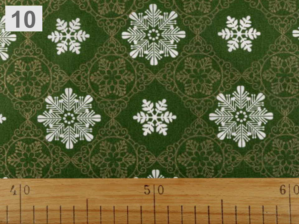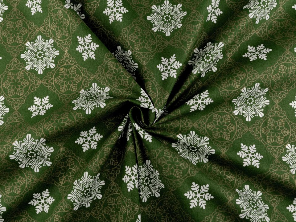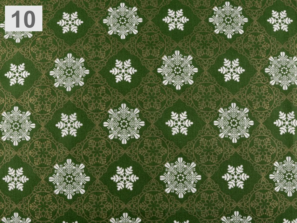 Bavlněnou látku zdobí zajímavé vzory s vánočními motivy.