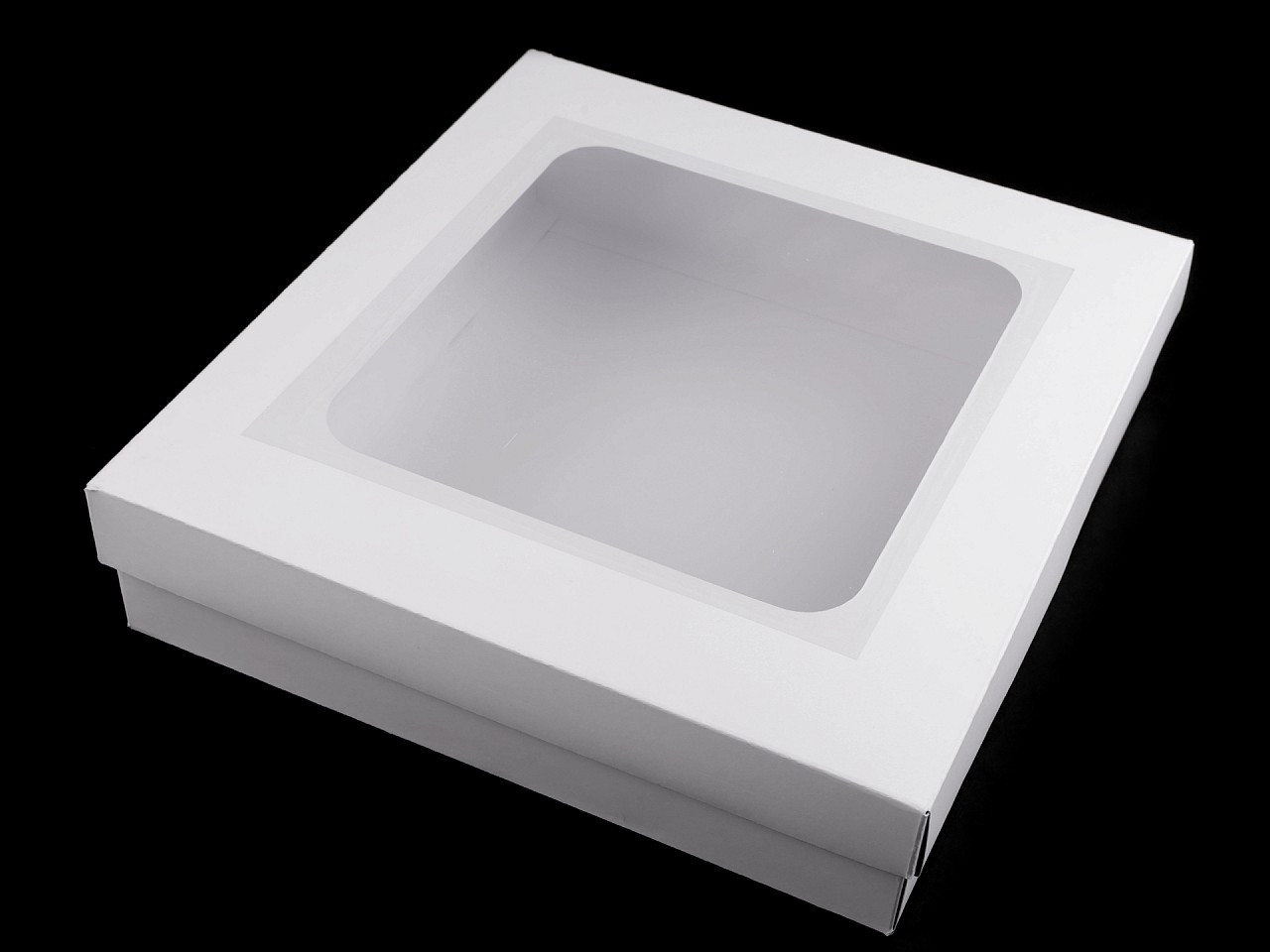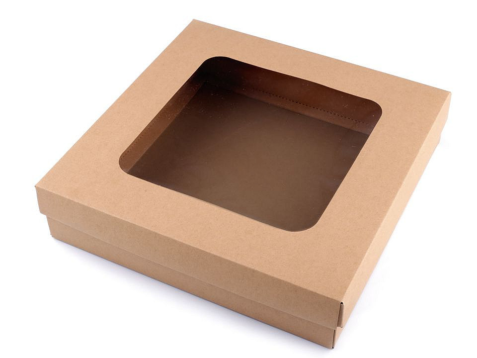 Čtvercová papírová krabice má výřez ve víku z průhledné fólie. Využijete ji na balení dárků, šátků, uložení baněk apod. Můžete si ji i dozdobit podle svého vkusu.