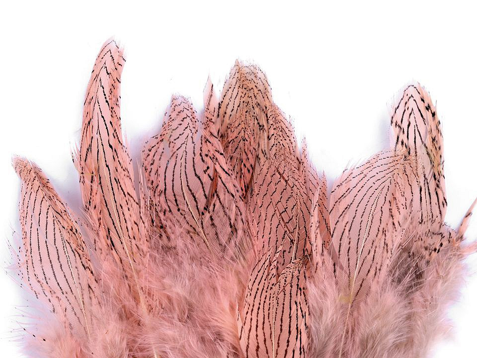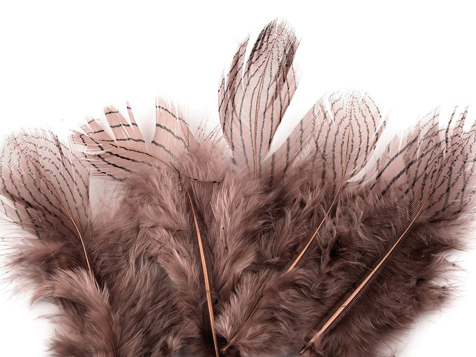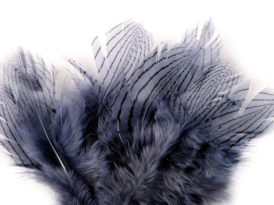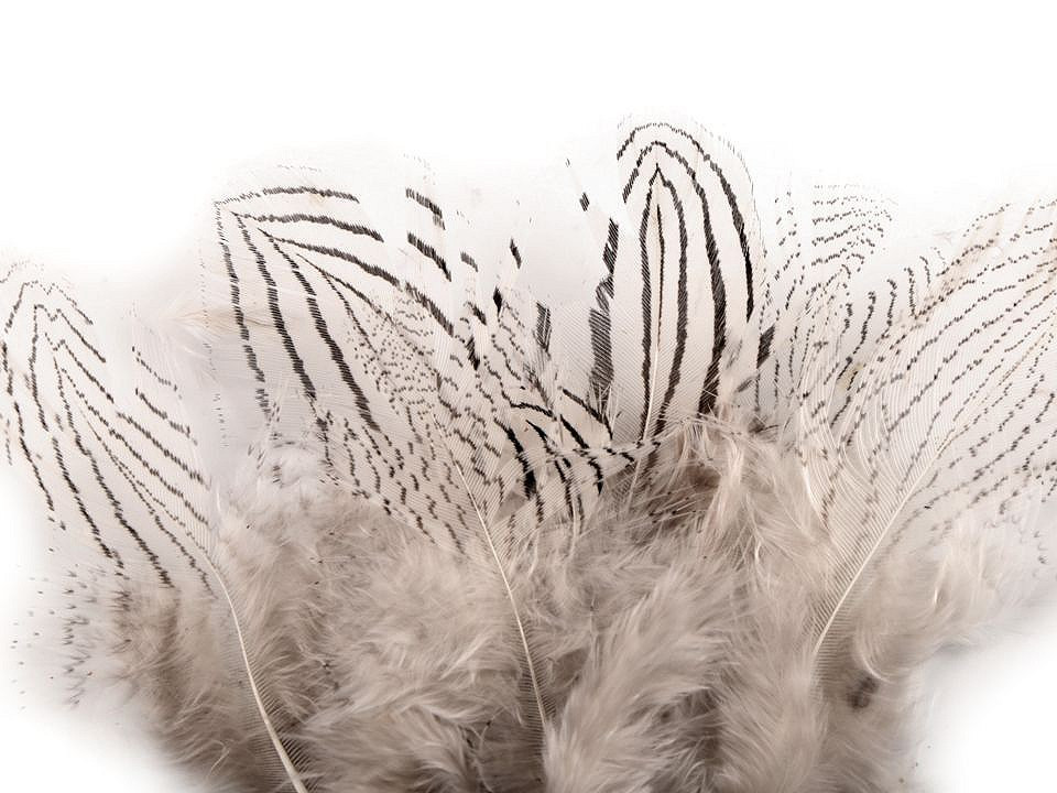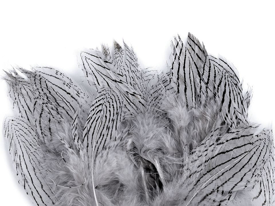 Ozdobná pírka ze stříbrného bažanta mají ve spodní části jemné chmýří, horní polovinu tvoří plochá část pírka, která má zajímavé zabarvení s proužky.