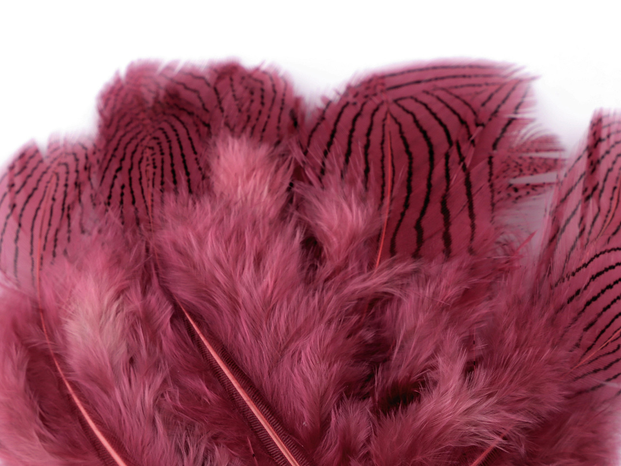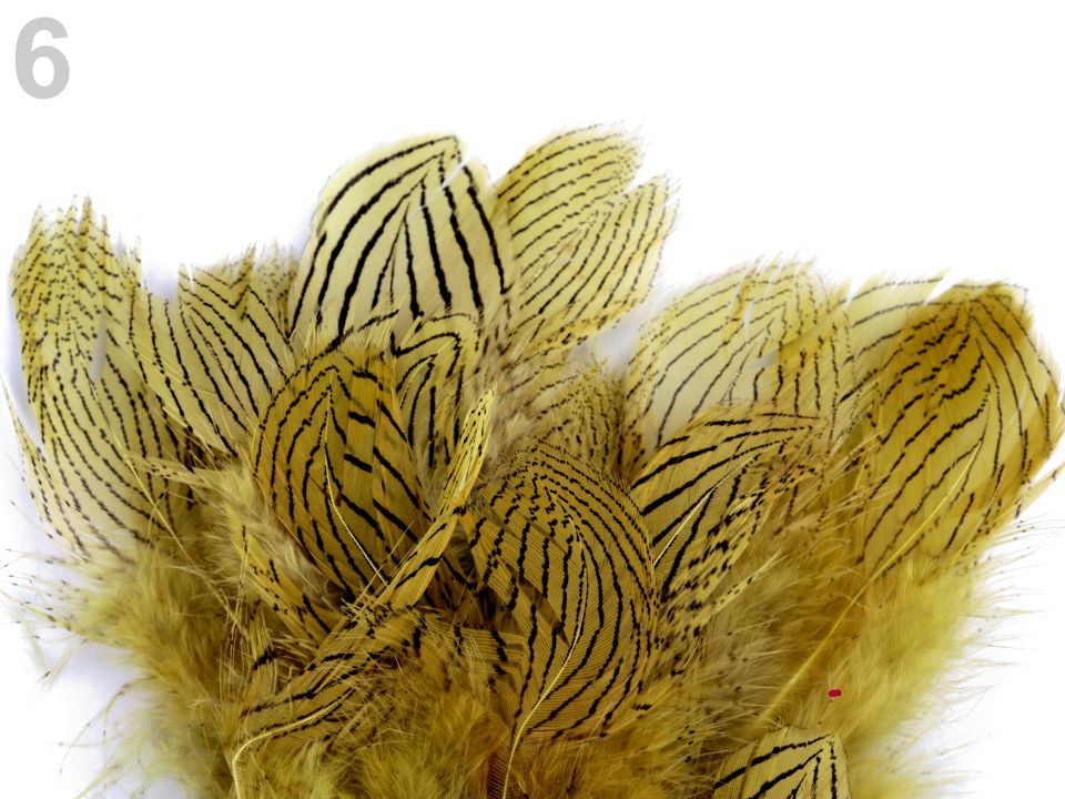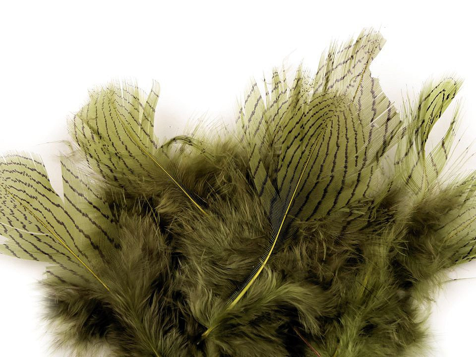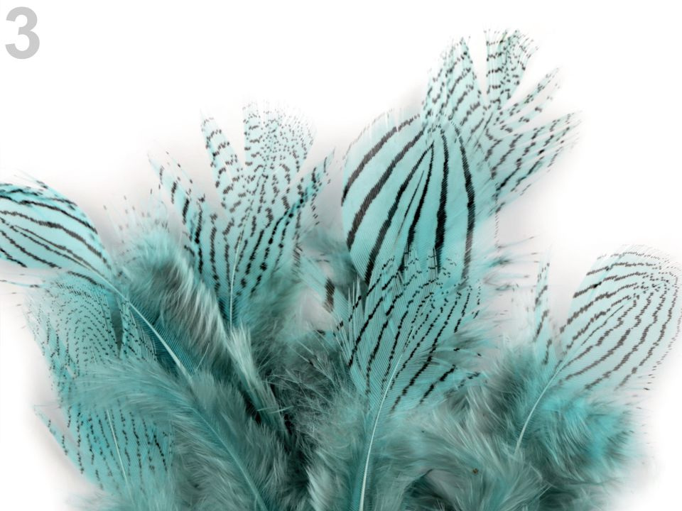 Ozdobná pírka ze stříbrného bažanta mají ve spodní části jemné chmýří, horní polovinu tvoří plochá část pírka, která má zajímavé zabarvení s proužky.