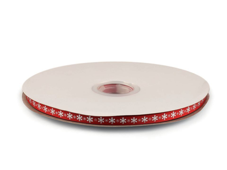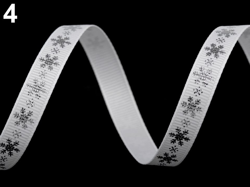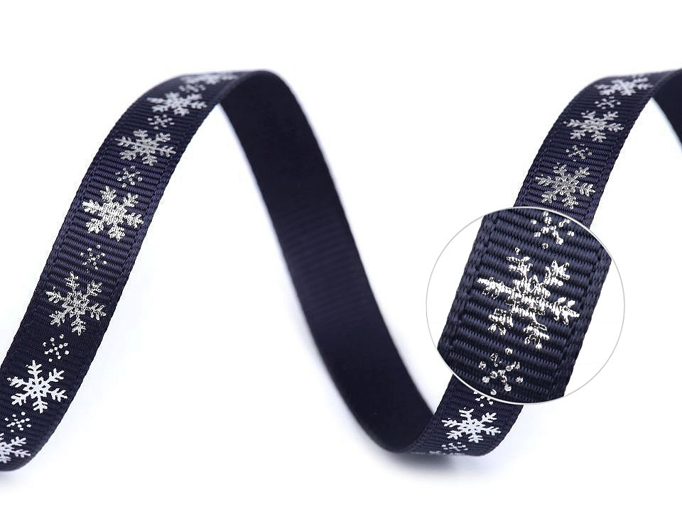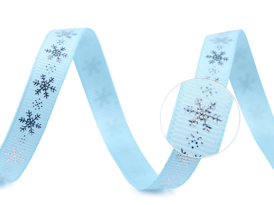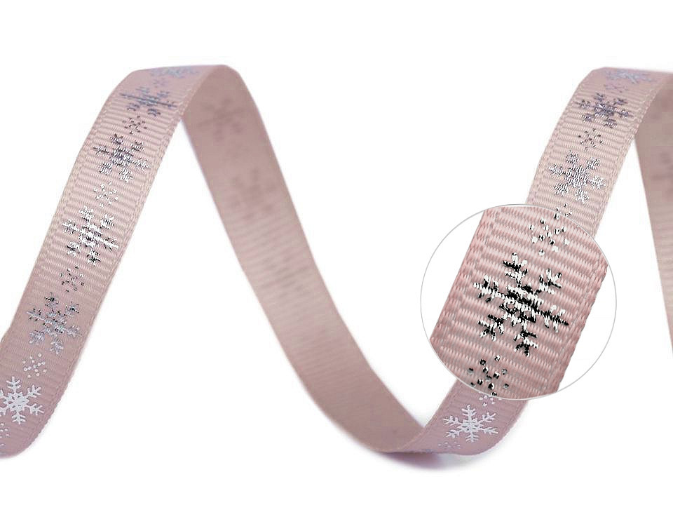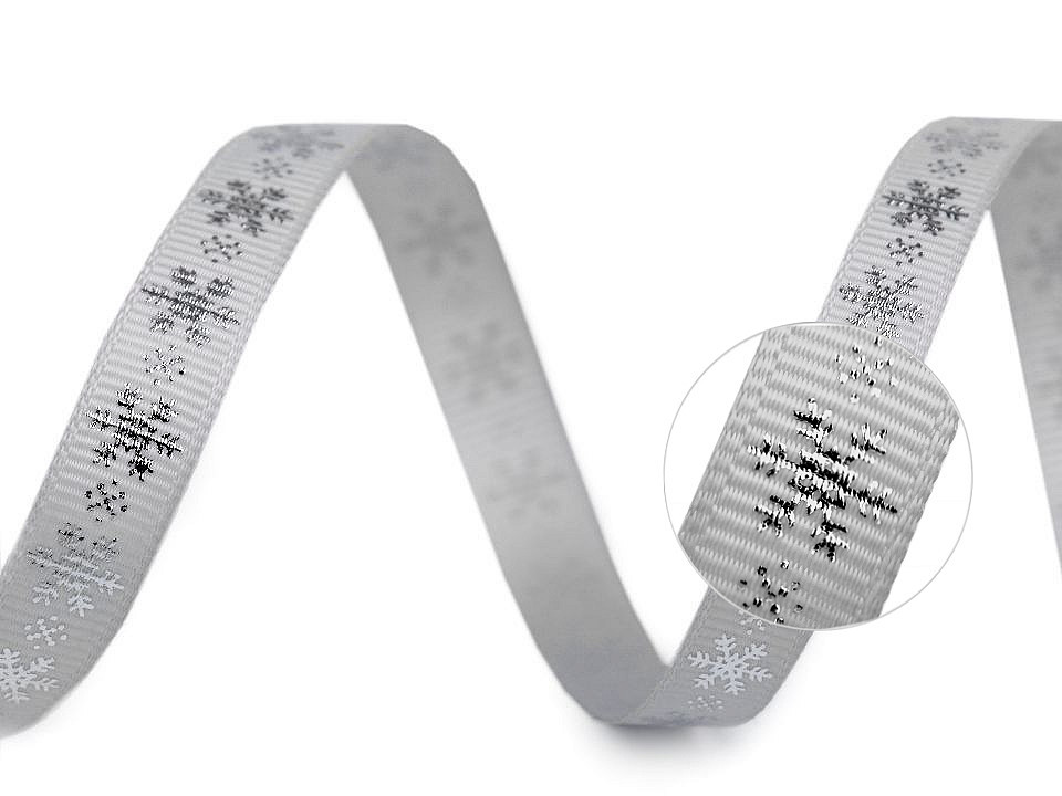 Dekorační rypsová stuha s potiskem vloček má na povrchu typické jemné žebrování. Potisk je jednostranný, metalický, připomíná lurex.