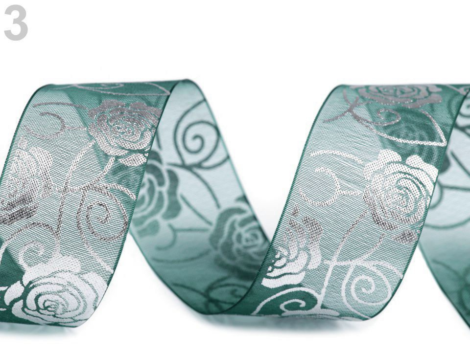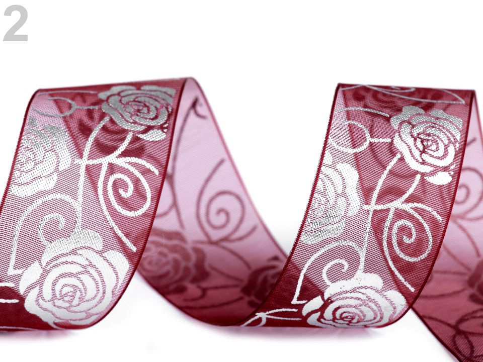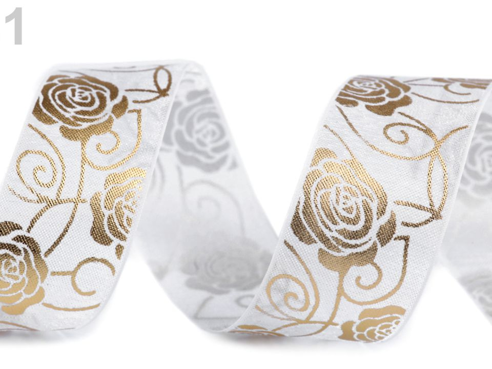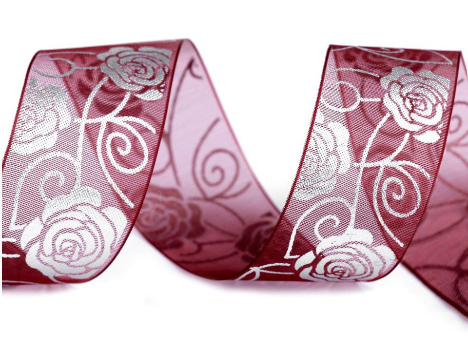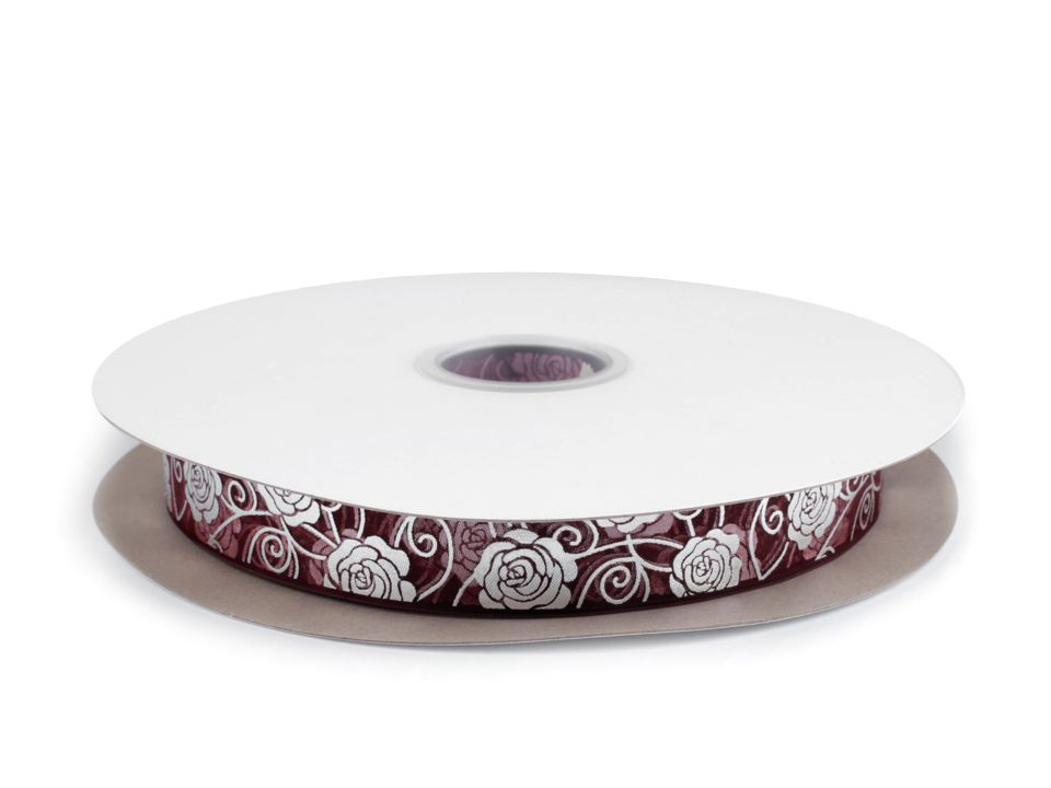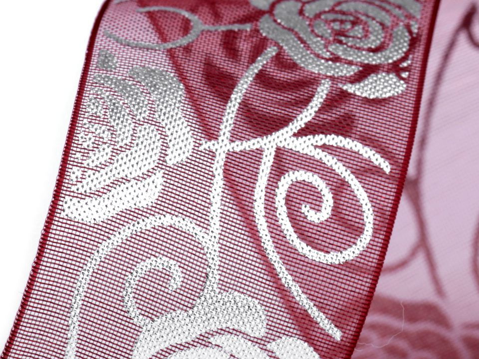 Dekorační šifonová stuha s metalickým potiskem růží najde široké uplatnění při tvorbě dekorací. Její materiál je poloprůsvitný. Potisk je jednostranný, poutavě se leskne.