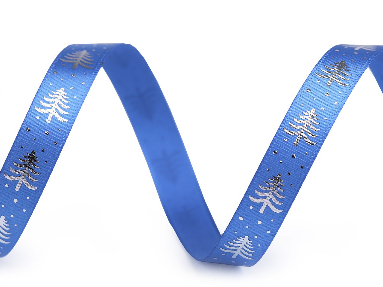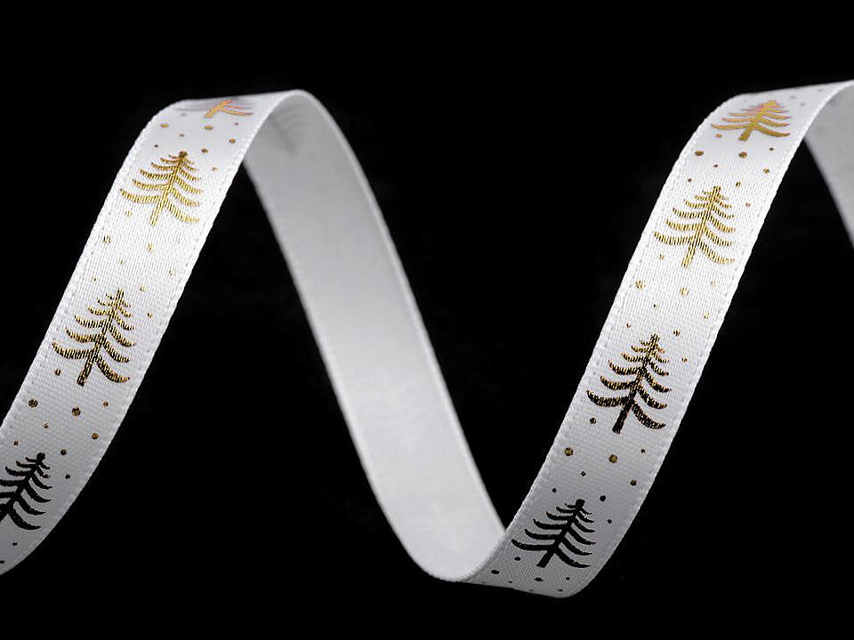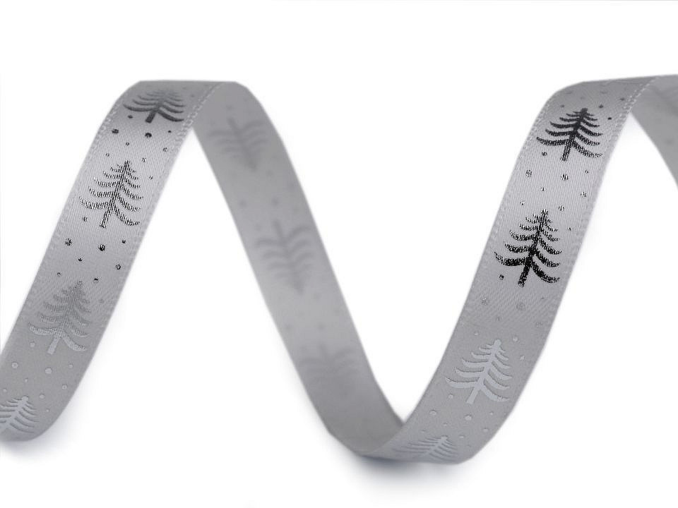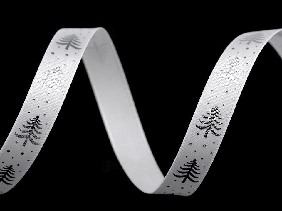 Dekorační saténová stuha s potiskem stromečků se sněhem. Potisk je jednostranný, metalický, připomíná lurex.