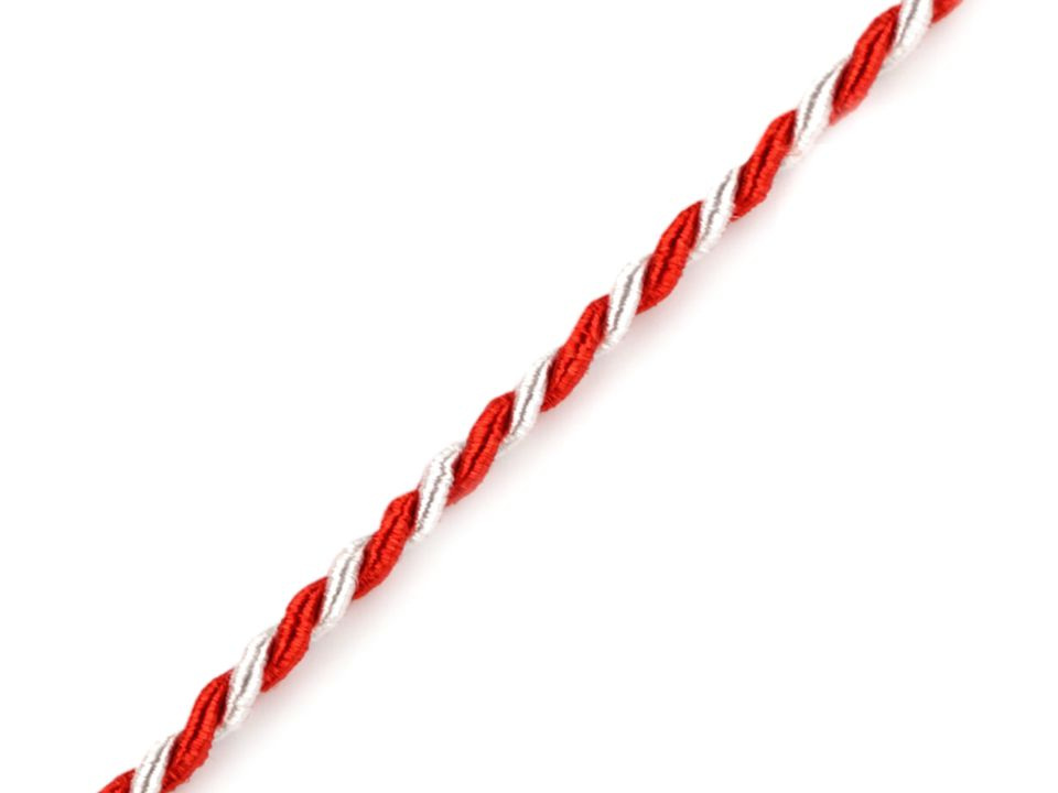 Dvoubarevná kroucená šňůra má saténový lesk. Je pevná, není pružná. Konce doporučujeme zakápnout lepidlem, aby se šňůra netřepila.