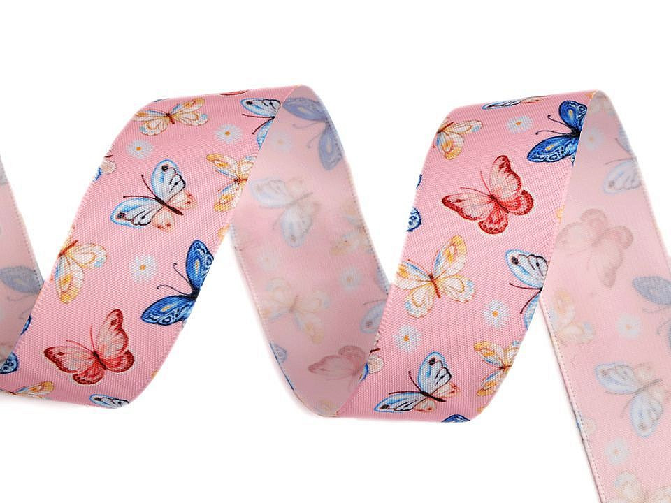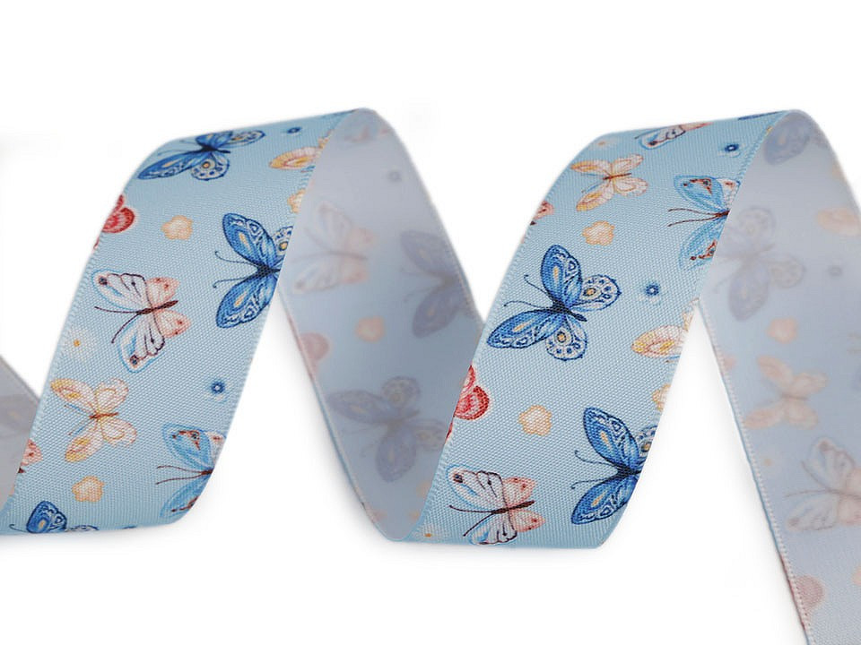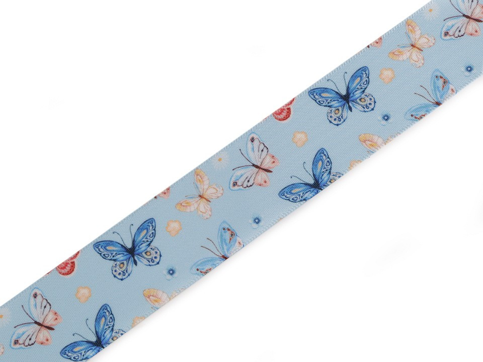 Saténová stuha zaujme svým kvalitním potiskem s motivy barevných motýlů. Potisk je jednostranný.
