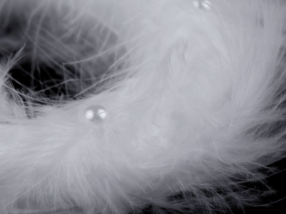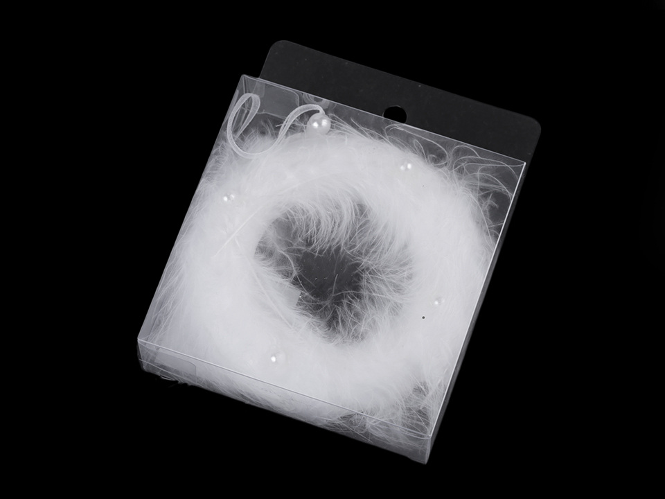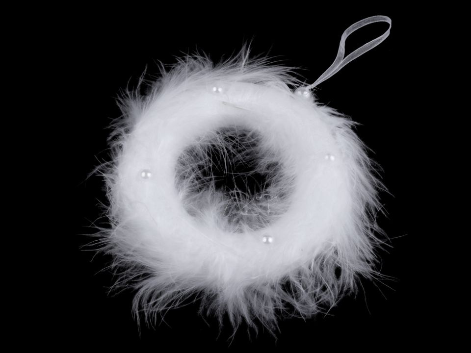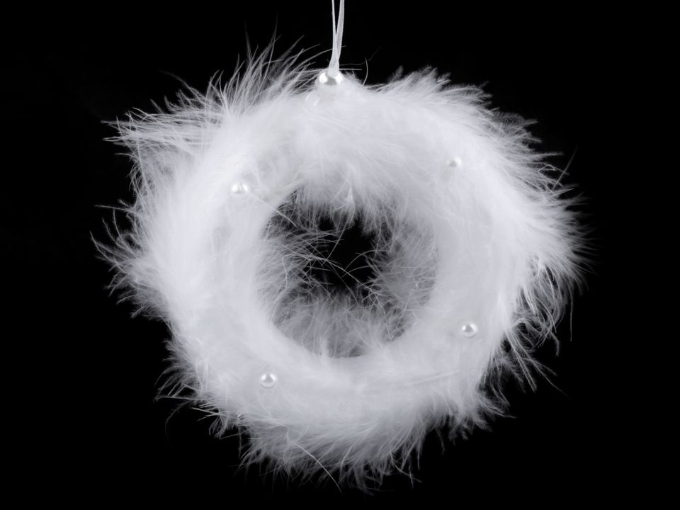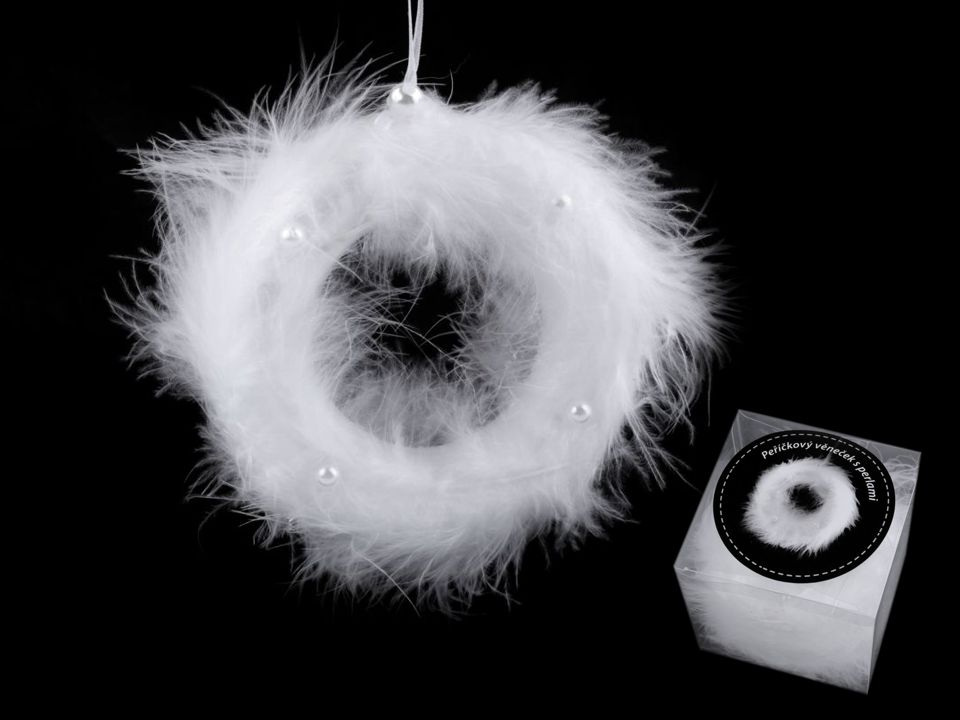 Dekorační věneček je vyrobený z polystyrenu, na kterém je nalepené načechrané peří a perly. V horní části je poutko ze stuhy na pohodlné zavěšení. Věneček můžete pověsit na stromek, na dveře nebo do okna.