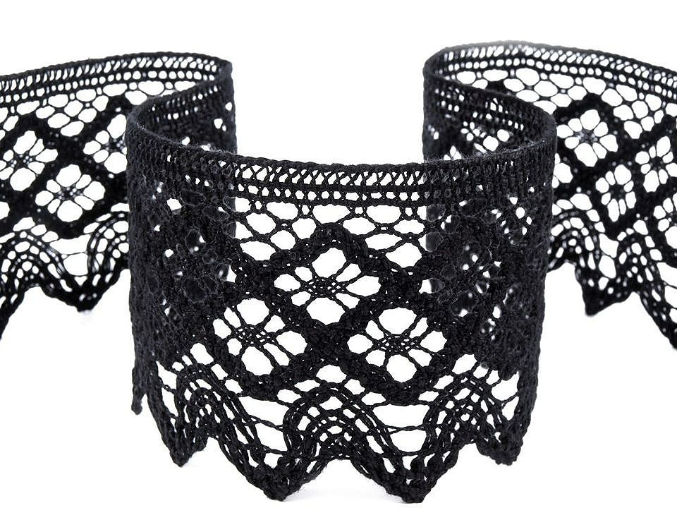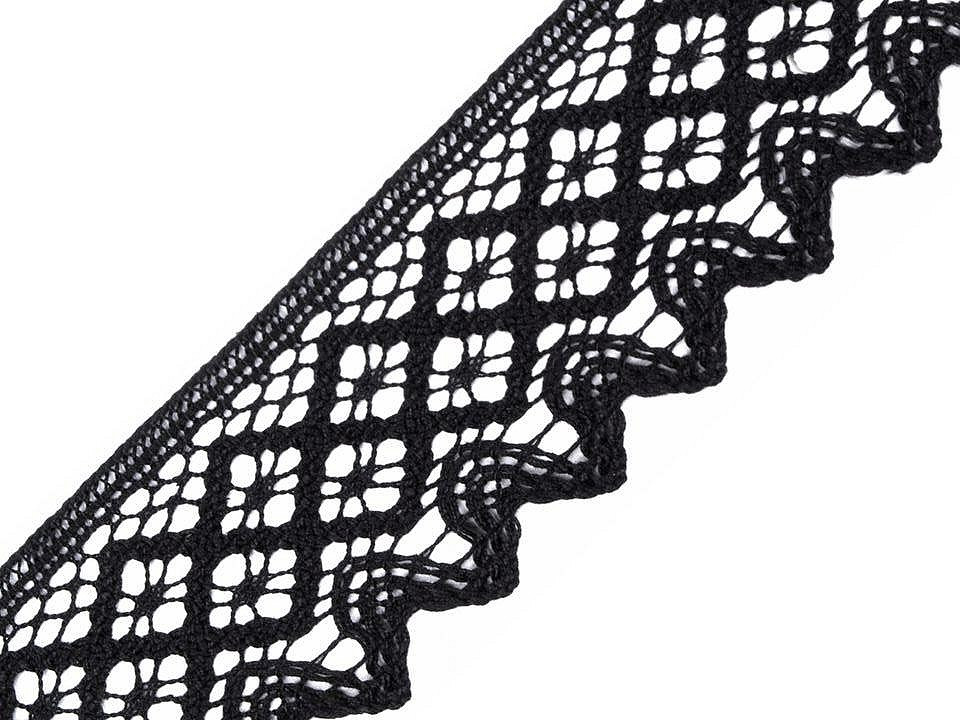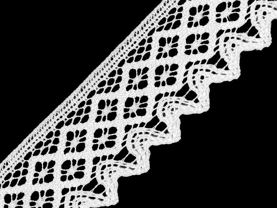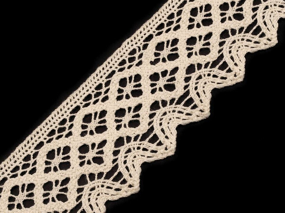 Bavlněná paličkovaná krajka je zdobená originálním motivem kosočtverců. Doporučujeme ji žehlit přes tkaninu.